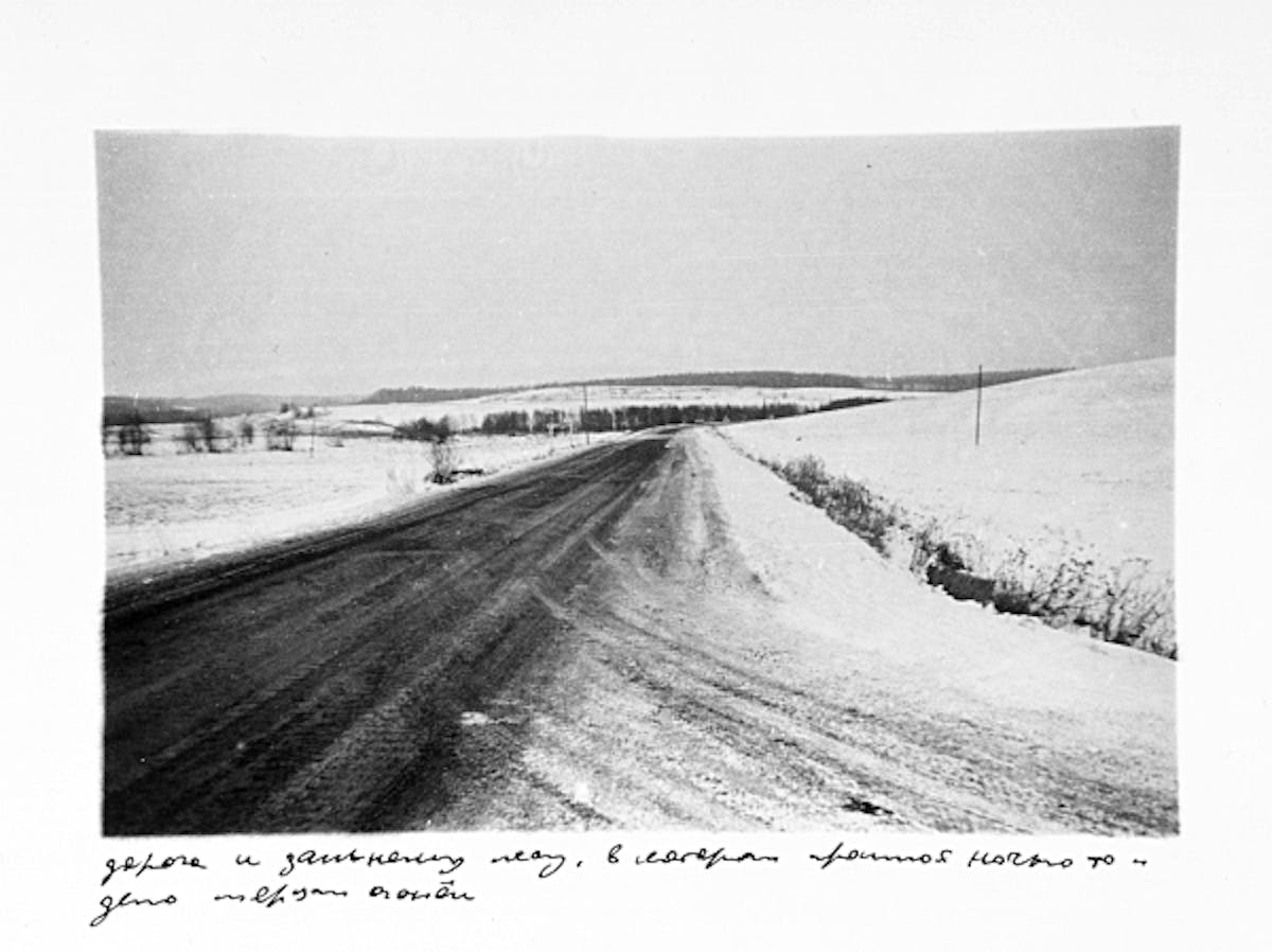 „Über dieses Foto“ Die Fotografie scheint Igor Savchenko nicht loszulassen. Mehr als einmal hängte er die Kamera an den Nagel und nahm sie dann, oft Jahre später, doch wieder zur Hand. Seine „Commented Landscapes“ sind auf den ersten Blick trügerisch schlichte, schwarz-weisse Landschaftsfotografien, oft auf einen klaren Fluchtpunkt zulaufend, deren Bildlegenden die Zusammenhänge zwischen Sujet, Fotografie, und dem Moment des Fotografierens beschreiben –und zuweilen auch verwirren. Ein sanft schimmernder Himmel taucht die kargen menschenarmen Szenerien in ein fast übersinnliches Licht.