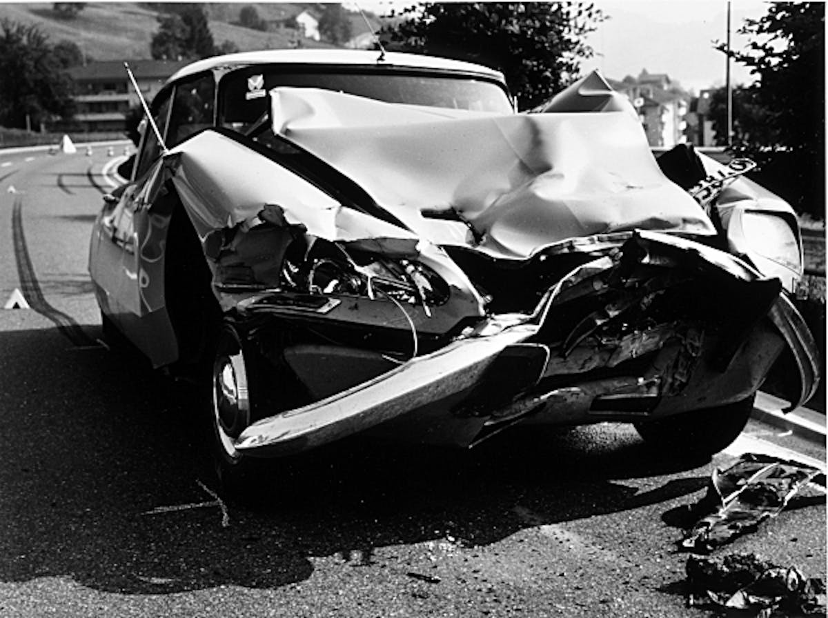 Der Polizeifotograf Arnold Odermatt hatte seinen Dienstauftrag, Unfälle zu fotografieren, mit grosser Genauigkeit und viel Sinn für das Bildhafte ausgeführt: Zwei Typen von Fotografien prägen seine „Karambolagen“: Landschaftsfotografien und fotografierte Skulpturen. Die schweizerische Landschaft mit ihren Wiesen, Bäumen und Seen, die immer ein wenig sonntäglich wirkt, wird in Odermatts Bildern unfreiwillig zu einer Bühne für Kuriosa. Eine meist sanfte, leicht schläfrige Landschaft wird an einer Stelle punktiert – peng, zwei Fahrzeuge ineinander verkeilt – oder überzogen von merkwürdigen Kratzern mit Endpunkt, einem Auto, aufgeprallt an einem Baum, einer Wand, die Abschrankung durchtrennt und halb im See gelandet. Eine Unfallstelle mitten in der Ordnung. Ein Unfall der Ordnung, gesäubert und bereits wieder „soweit geordnet“. Der zweite Typus zieht den Blickradius weit enger, fokussiert auf das Auto, ist skulptural: Nahaufnahmen von ineinander verkeilten Wagen, von aufgeschlitzten Kotflügeln, aufgerissenen Kühlerhauben, zerdepperten Scheiben. Eine Art von „unvoluntary sculptures“, von unfreiwilligen Skulpturen, entstehen durch die nüchtern, sachlich und präzis aufgenommenen Fotografien. Es ist Auftragsfotografie der fünfziger, sechziger, siebziger Jahre und als solche auch zu verstehen, doch der Wert, der Schaugenuss vor diesen Bildern gehen weit darüber hinaus.