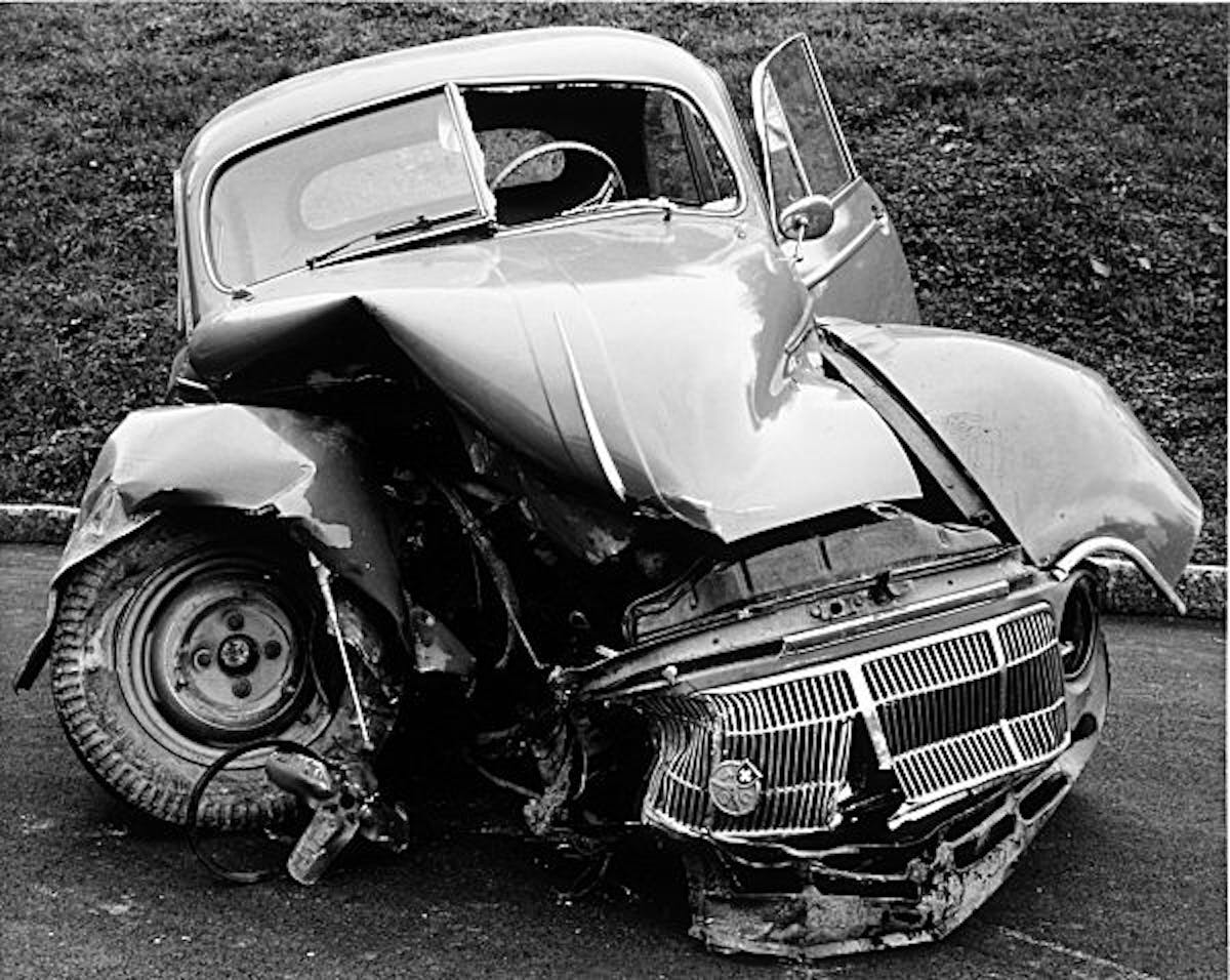 Der Polizeifotograf Arnold Odermatt hatte seinen Dienstauftrag, Unfälle zu fotografieren, mit grosser Genauigkeit und viel Sinn für das Bildhafte ausgeführt: Zwei Typen von Fotografien prägen seine „Karambolagen“: Landschaftsfotografien und fotografierte Skulpturen. Die schweizerische Landschaft mit ihren Wiesen, Bäumen und Seen, die immer ein wenig sonntäglich wirkt, wird in Odermatts Bildern unfreiwillig zu einer Bühne für Kuriosa. Eine meist sanfte, leicht schläfrige Landschaft wird an einer Stelle punktiert – peng, zwei Fahrzeuge ineinander verkeilt – oder überzogen von merkwürdigen Kratzern mit Endpunkt, einem Auto, aufgeprallt an einem Baum, einer Wand, die Abschrankung durchtrennt und halb im See gelandet. Eine Unfallstelle mitten in der Ordnung. Ein Unfall der Ordnung, gesäubert und bereits wieder „soweit geordnet“. Der zweite Typus zieht den Blickradius weit enger, fokussiert auf das Auto, ist skulptural: Nahaufnahmen von ineinander verkeilten Wagen, von aufgeschlitzten Kotflügeln, aufgerissenen Kühlerhauben, zerdepperten Scheiben. Eine Art von „unvoluntary sculptures“, von unfreiwilligen Skulpturen, entstehen durch die nüchtern, sachlich und präzis aufgenommenen Fotografien. Es ist Auftragsfotografie der fünfziger, sechziger, siebziger Jahre und als solche auch zu verstehen, doch der Wert, der Schaugenuss vor diesen Bildern gehen weit darüber hinaus.