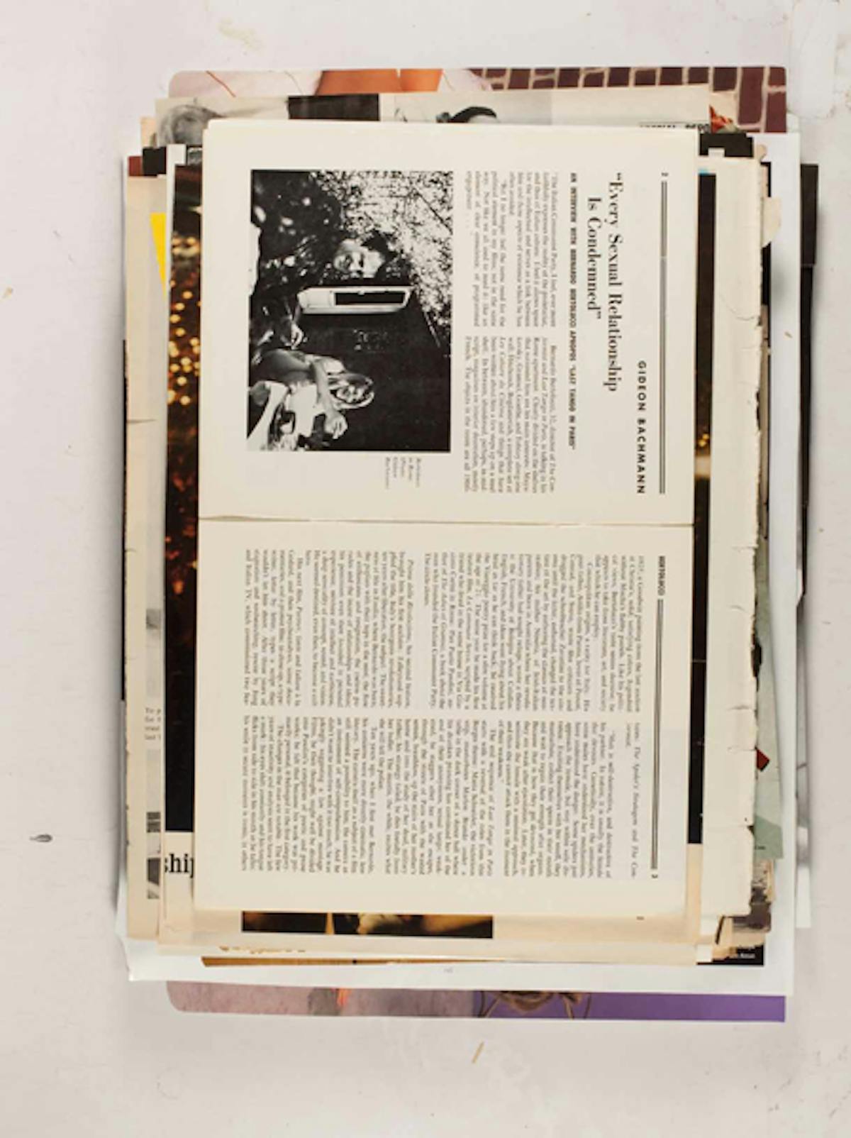 Der New Yorker Konzeptkünstler Leigh Ledare dokumentiert in seinem Projekt Ephemeras, das innerhalb seines Werks Double Bind (2010) entstanden ist, den Zeitgeist der 1960/70er Jahre bis heute. Es ist sozusagen sein eigenes Archiv, eine Serie von Bildern, die Ledare über eine lange Zeitspanne hinweg aus Magazinen und anderen Druckmaterialien herausgerissen hat. Die insgesamt 480 Seiten wurden in sechs Stapeln mit je 80 Seiten reproduziert. Die einzelnen Bilder scheinen keine Ordnung und keinen Zusammenhang zu haben. Es handelt sich hauptsächlich um Modebilder, Anzeigen, Auszüge aus Reportagen sowie pornografische Inhalte. So erscheint das Werk wie eine mehrschichtige Collage, bei der beispielsweise der Schnipsel einer Werbung für Kinderspielsachen einem pornografisches Bild aus den 1970 Jahren folgt. Ledare, der lange als Assistent von Larry Clark gearbeitet hat, ist eigentlich bekannt geworden durch sein Projekt Pretend You’re Actually Alive (2008) – eine kontroverse Serie zur ödipalen Beziehung mit seiner Mutter.