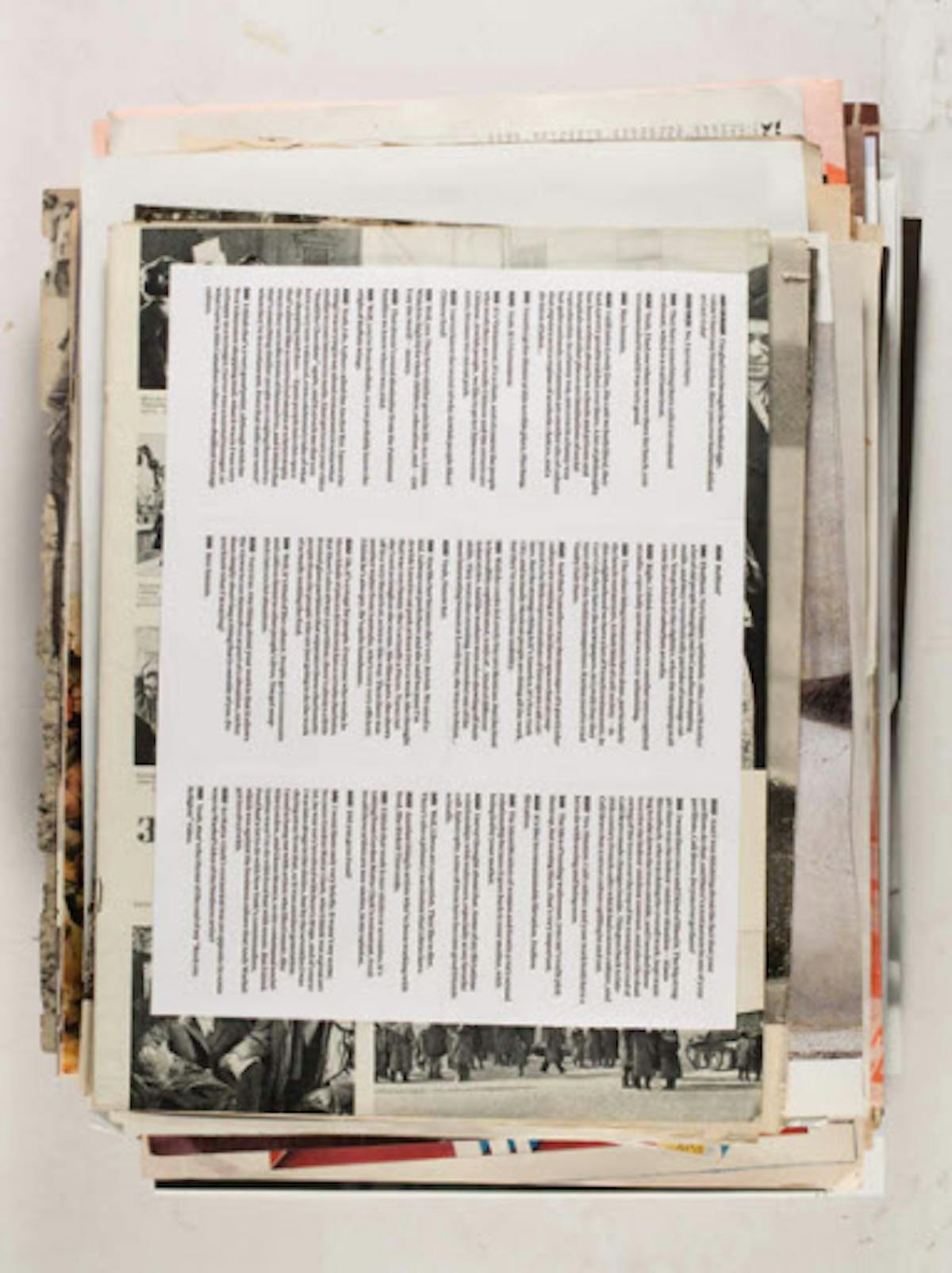 Der New Yorker Konzeptkünstler Leigh Ledare dokumentiert in seinem Projekt Ephemeras, das innerhalb seines Werks Double Bind (2010) entstanden ist, den Zeitgeist der 1960/70er Jahre bis heute. Es ist sozusagen sein eigenes Archiv, eine Serie von Bildern, die Ledare über eine lange Zeitspanne hinweg aus Magazinen und anderen Druckmaterialien herausgerissen hat. Die insgesamt 480 Seiten wurden in sechs Stapeln mit je 80 Seiten reproduziert. Die einzelnen Bilder scheinen keine Ordnung und keinen Zusammenhang zu haben. Es handelt sich hauptsächlich um Modebilder, Anzeigen, Auszüge aus Reportagen sowie pornografische Inhalte. So erscheint das Werk wie eine mehrschichtige Collage, bei der beispielsweise der Schnipsel einer Werbung für Kinderspielsachen einem pornografisches Bild aus den 1970 Jahren folgt. Ledare, der lange als Assistent von Larry Clark gearbeitet hat, ist eigentlich bekannt geworden durch sein Projekt Pretend You’re Actually Alive (2008) – eine kontroverse Serie zur ödipalen Beziehung mit seiner Mutter.