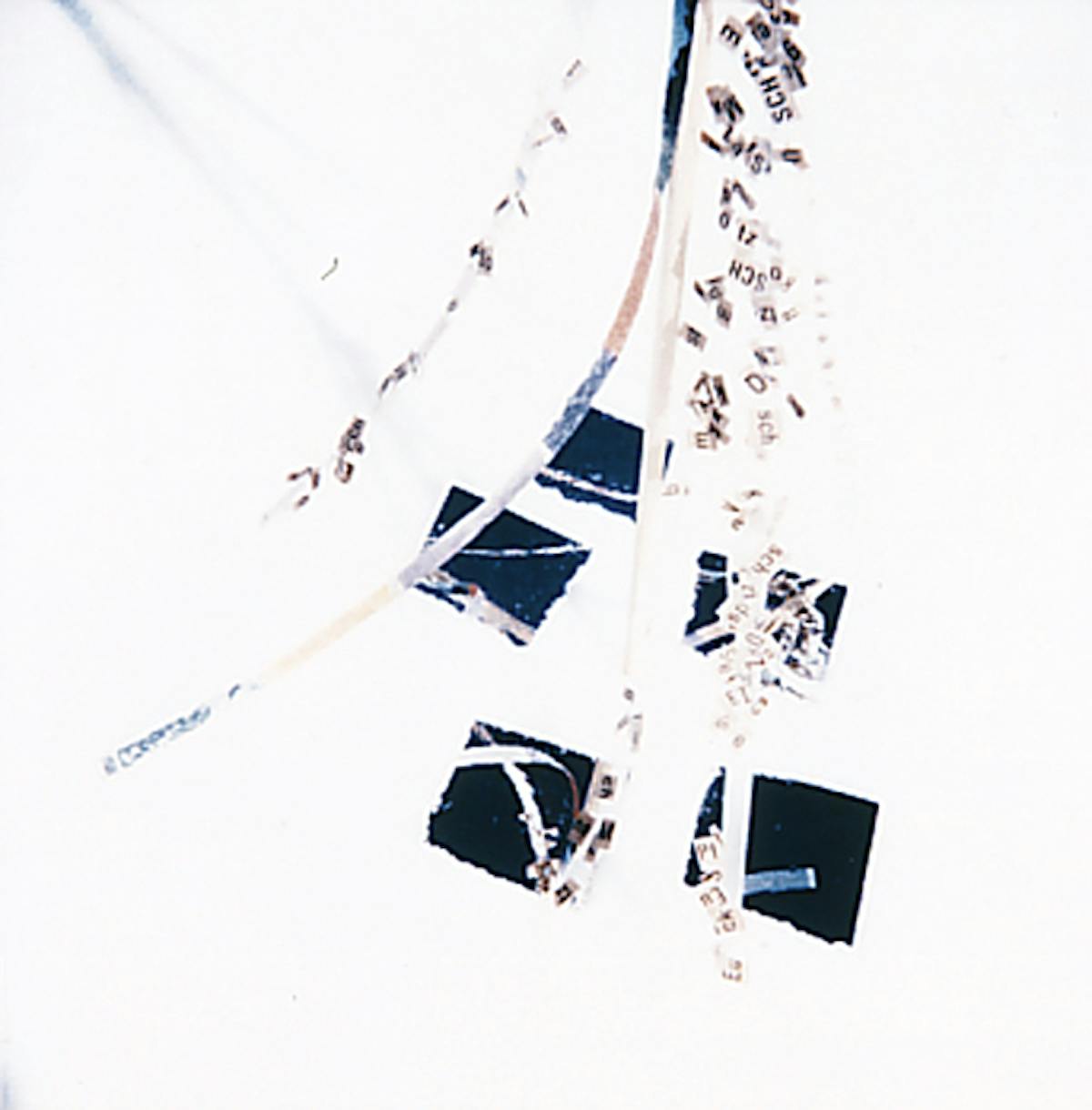 Der Luzerner Künstler, bekannt für sein Schaffen in vielen verschiedenen Medien, bekannt auch für seine gedanklich und gestalterisch präzisen Arbeiten, die im wesentlichen um das Thema offener, floatender Energien streifen – Energien, die sich dann und wann zu Flüssen verdichten, die sich niederschlagen, Ausfällungen produzieren, als Gewicht auf der Waage, als Linie auf der Wand, als Kurve im Raum, als seismographische Notate auf Papier –, dieser Christoph Rütimann lebt seine poetische Seite vielleicht am stärksten in seinen Polaroid-Arbeiten aus, die er in manchen Winterferien tatsächlich im Schnee inszeniert hat, verschiedene erzählerische, theatralische Szenen, Geschichten im Schnee. Man gewinnt den Eindruck, der Schnee bilde eine hervorragende, halbdurchscheinende, halbpräsente Bühne für die verschiedensten Bildgeschichten, Bilderrätsel, Bilderspiele. Kleine szenische Stücke, teils mitintegriert das eigene und das Bildnis seiner Freundin, die aus lauter Fragmenten von ausgeschnittenen Fotos, Hölzchen, Stäbchen, Klebband ein schönes rätselhaftes Bild-Gewebe inszenieren, zum Beispiel eine Art wunderbarer modellhafter Gartenanlage, mit Gebäuden aus gelben, roten oder grünen Bausteinen vor quadratischen Teichen in tiefem Blau. Verkehrte Grössenverhältnisse, fragmentierte Figuren und Wörter, reale Gegenstände und ausgeschnittene Fotofiguren entfachen zusammen einen poetisch-bildnerischen Zauber.
