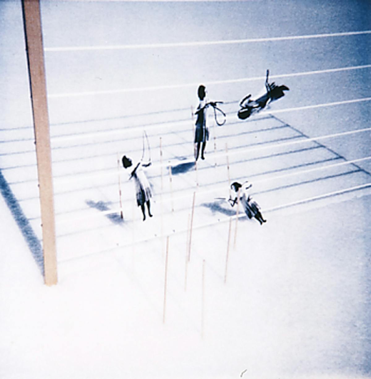 Der Luzerner Künstler, bekannt für sein Schaffen in vielen verschiedenen Medien, bekannt auch für seine gedanklich und gestalterisch präzisen Arbeiten, die im wesentlichen um das Thema offener, floatender Energien streifen – Energien, die sich dann und wann zu Flüssen verdichten, die sich niederschlagen, Ausfällungen produzieren, als Gewicht auf der Waage, als Linie auf der Wand, als Kurve im Raum, als seismographische Notate auf Papier –, dieser Christoph Rütimann lebt seine poetische Seite vielleicht am stärksten in seinen Polaroid-Arbeiten aus, die er in manchen Winterferien tatsächlich im Schnee inszeniert hat, verschiedene erzählerische, theatralische Szenen, Geschichten im Schnee. Man gewinnt den Eindruck, der Schnee bilde eine hervorragende, halbdurchscheinende, halbpräsente Bühne für die verschiedensten Bildgeschichten, Bilderrätsel, Bilderspiele. Kleine szenische Stücke, teils mitintegriert das eigene und das Bildnis seiner Freundin, die aus lauter Fragmenten von ausgeschnittenen Fotos, Hölzchen, Stäbchen, Klebband ein schönes rätselhaftes Bild-Gewebe inszenieren, zum Beispiel eine Art wunderbarer modellhafter Gartenanlage, mit Gebäuden aus gelben, roten oder grünen Bausteinen vor quadratischen Teichen in tiefem Blau. Verkehrte Grössenverhältnisse, fragmentierte Figuren und Wörter, reale Gegenstände und ausgeschnittene Fotofiguren entfachen zusammen einen poetisch-bildnerischen Zauber.