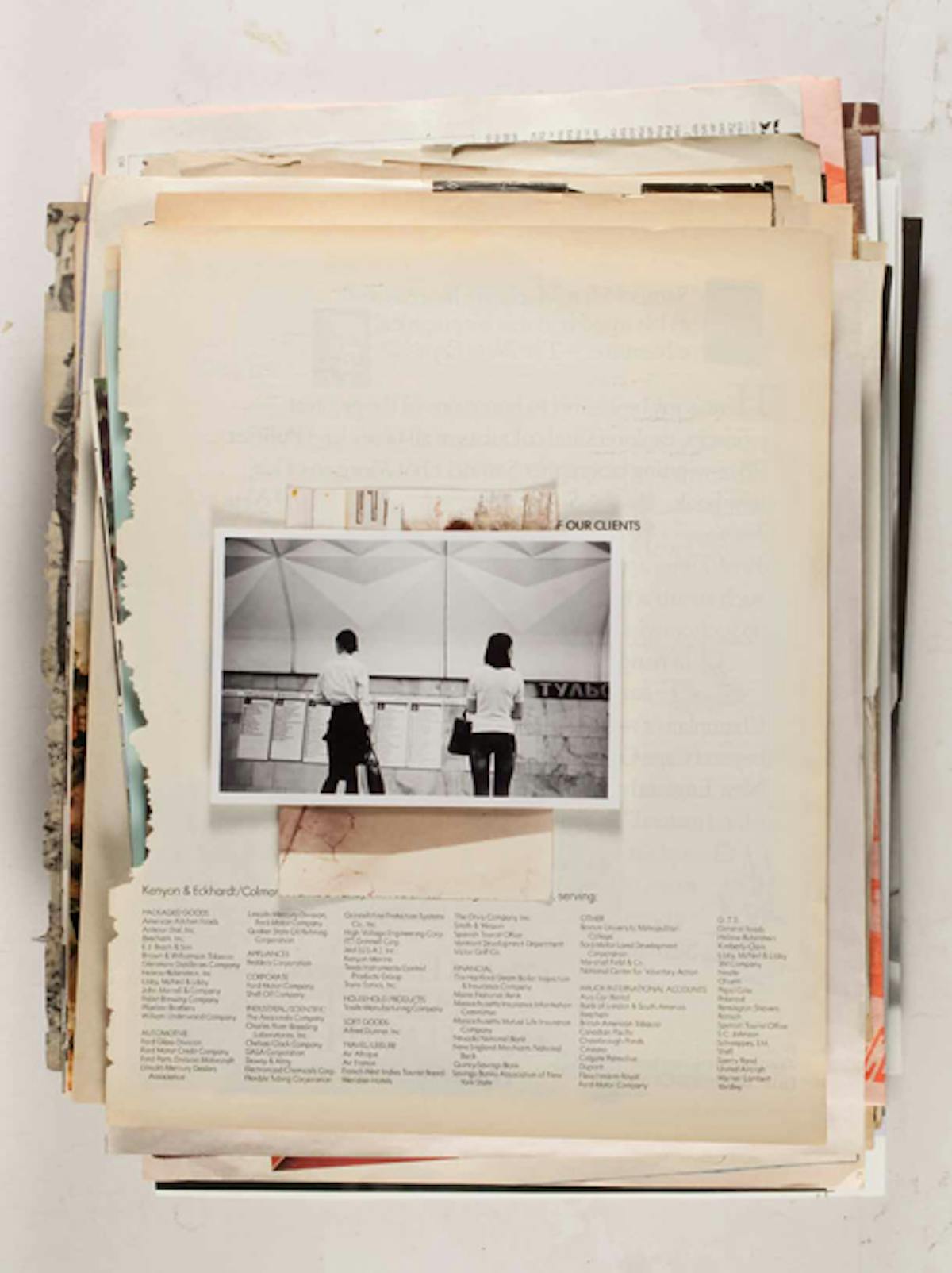 Der New Yorker Konzeptkünstler Leigh Ledare dokumentiert in seinem Projekt Ephemeras, das innerhalb seines Werks Double Bind (2010) entstanden ist, den Zeitgeist der 1960/70er Jahre bis heute. Es ist sozusagen sein eigenes Archiv, eine Serie von Bildern, die Ledare über eine lange Zeitspanne hinweg aus Magazinen und anderen Druckmaterialien herausgerissen hat. Die insgesamt 480 Seiten wurden in sechs Stapeln mit je 80 Seiten reproduziert. Die einzelnen Bilder scheinen keine Ordnung und keinen Zusammenhang zu haben. Es handelt sich hauptsächlich um Modebilder, Anzeigen, Auszüge aus Reportagen sowie pornografische Inhalte. So erscheint das Werk wie eine mehrschichtige Collage, bei der beispielsweise der Schnipsel einer Werbung für Kinderspielsachen einem pornografisches Bild aus den 1970 Jahren folgt. Ledare, der lange als Assistent von Larry Clark gearbeitet hat, ist eigentlich bekannt geworden durch sein Projekt Pretend You’re Actually Alive (2008) – eine kontroverse Serie zur ödipalen Beziehung mit seiner Mutter.