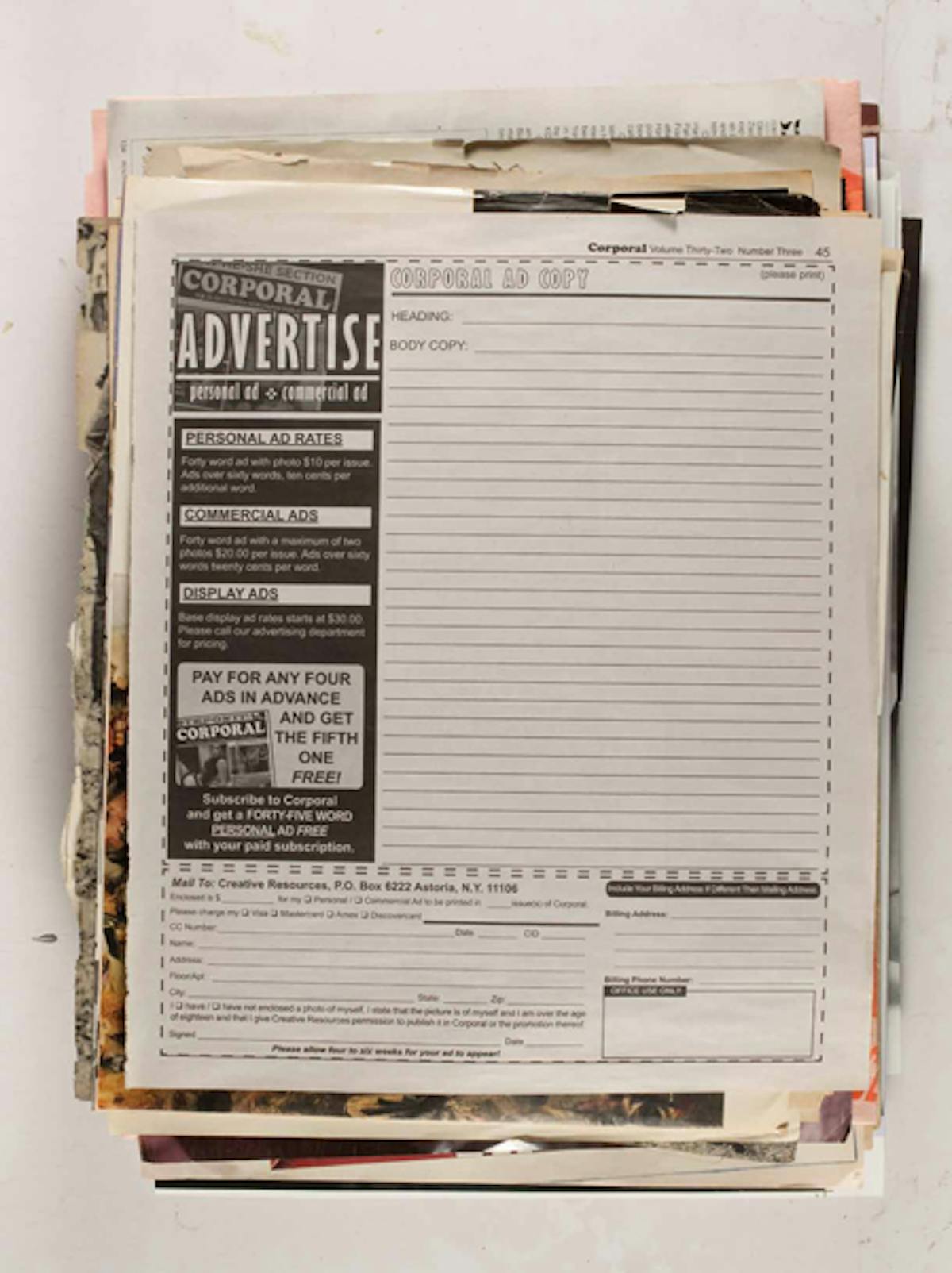 Der New Yorker Konzeptkünstler Leigh Ledare dokumentiert in seinem Projekt Ephemeras, das innerhalb seines Werks Double Bind (2010) entstanden ist, den Zeitgeist der 1960/70er Jahre bis heute. Es ist sozusagen sein eigenes Archiv, eine Serie von Bildern, die Ledare über eine lange Zeitspanne hinweg aus Magazinen und anderen Druckmaterialien herausgerissen hat. Die insgesamt 480 Seiten wurden in sechs Stapeln mit je 80 Seiten reproduziert. Die einzelnen Bilder scheinen keine Ordnung und keinen Zusammenhang zu haben. Es handelt sich hauptsächlich um Modebilder, Anzeigen, Auszüge aus Reportagen sowie pornografische Inhalte. So erscheint das Werk wie eine mehrschichtige Collage, bei der beispielsweise der Schnipsel einer Werbung für Kinderspielsachen einem pornografisches Bild aus den 1970 Jahren folgt. Ledare, der lange als Assistent von Larry Clark gearbeitet hat, ist eigentlich bekannt geworden durch sein Projekt Pretend You’re Actually Alive (2008) – eine kontroverse Serie zur ödipalen Beziehung mit seiner Mutter.