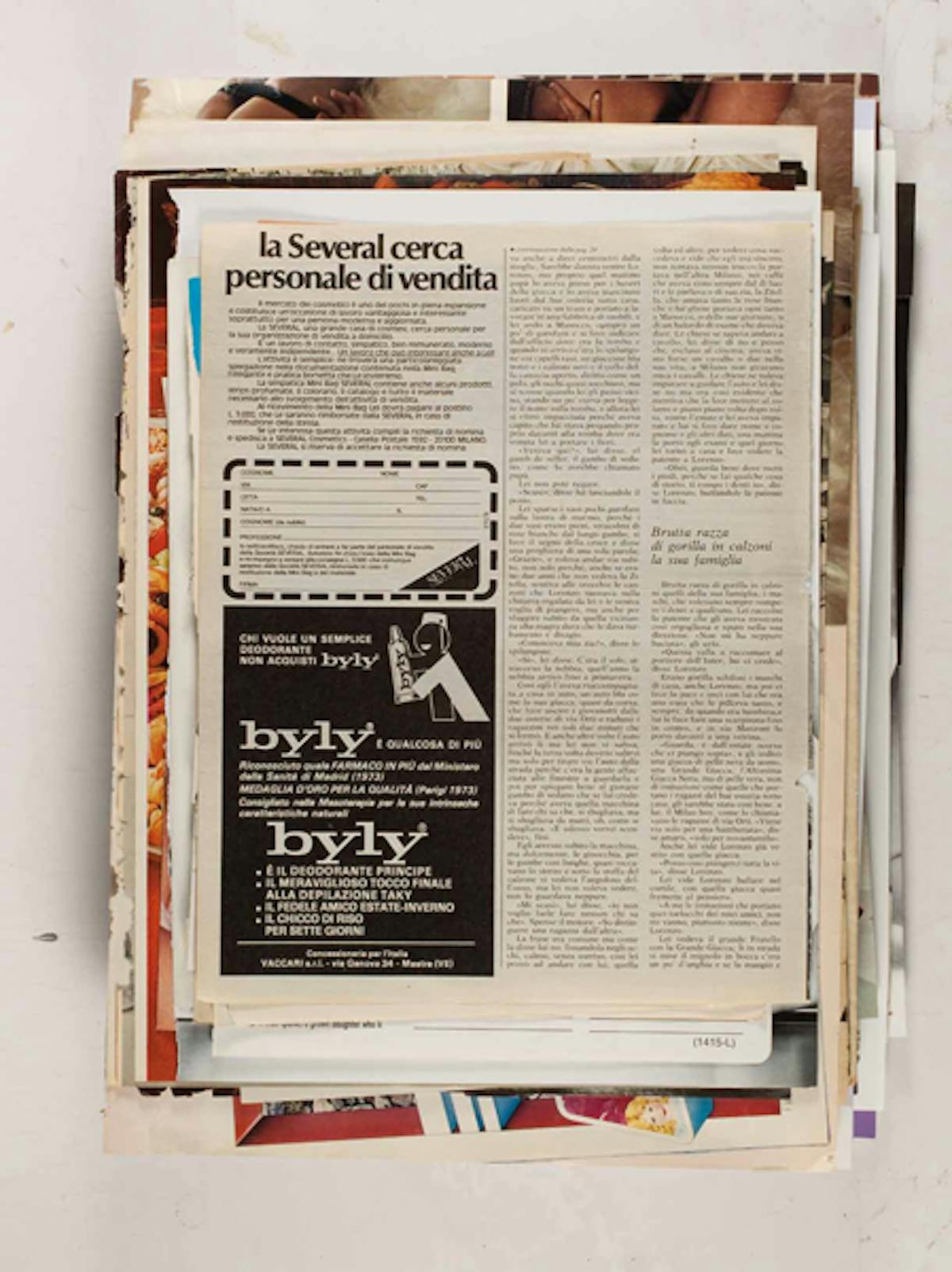 Der New Yorker Konzeptkünstler Leigh Ledare dokumentiert in seinem Projekt Ephemeras, das innerhalb seines Werks Double Bind (2010) entstanden ist, den Zeitgeist der 1960/70er Jahre bis heute. Es ist sozusagen sein eigenes Archiv, eine Serie von Bildern, die Ledare über eine lange Zeitspanne hinweg aus Magazinen und anderen Druckmaterialien herausgerissen hat. Die insgesamt 480 Seiten wurden in sechs Stapeln mit je 80 Seiten reproduziert. Die einzelnen Bilder scheinen keine Ordnung und keinen Zusammenhang zu haben. Es handelt sich hauptsächlich um Modebilder, Anzeigen, Auszüge aus Reportagen sowie pornografische Inhalte. So erscheint das Werk wie eine mehrschichtige Collage, bei der beispielsweise der Schnipsel einer Werbung für Kinderspielsachen einem pornografisches Bild aus den 1970 Jahren folgt. Ledare, der lange als Assistent von Larry Clark gearbeitet hat, ist eigentlich bekannt geworden durch sein Projekt Pretend You’re Actually Alive (2008) – eine kontroverse Serie zur ödipalen Beziehung mit seiner Mutter.