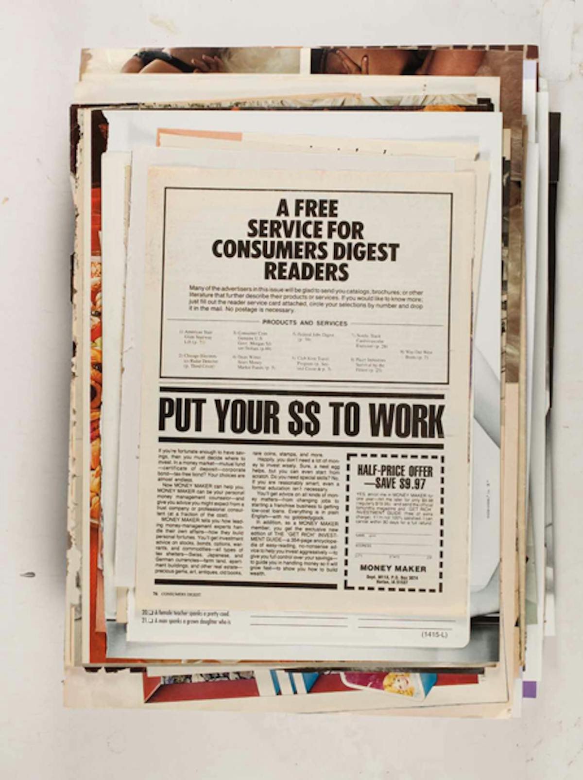 Der New Yorker Konzeptkünstler Leigh Ledare dokumentiert in seinem Projekt Ephemeras, das innerhalb seines Werks Double Bind (2010) entstanden ist, den Zeitgeist der 1960/70er Jahre bis heute. Es ist sozusagen sein eigenes Archiv, eine Serie von Bildern, die Ledare über eine lange Zeitspanne hinweg aus Magazinen und anderen Druckmaterialien herausgerissen hat. Die insgesamt 480 Seiten wurden in sechs Stapeln mit je 80 Seiten reproduziert. Die einzelnen Bilder scheinen keine Ordnung und keinen Zusammenhang zu haben. Es handelt sich hauptsächlich um Modebilder, Anzeigen, Auszüge aus Reportagen sowie pornografische Inhalte. So erscheint das Werk wie eine mehrschichtige Collage, bei der beispielsweise der Schnipsel einer Werbung für Kinderspielsachen einem pornografisches Bild aus den 1970 Jahren folgt. Ledare, der lange als Assistent von Larry Clark gearbeitet hat, ist eigentlich bekannt geworden durch sein Projekt Pretend You’re Actually Alive (2008) – eine kontroverse Serie zur ödipalen Beziehung mit seiner Mutter.