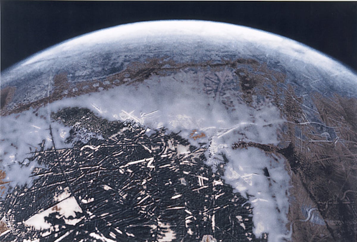 Hannes Rickli haben immer Parallelen der Erkenntnis- und Wahrheitsfindung in Kunst und Wissenschaft interessiert. Seine Installation “Spurenkugel”, aus der diese Fotografien stammen, ähnelt zwar einer wissenschaftlichen Vorrichtung zur Erzeugung gesicherter Wahrheiten, aber sie entpuppt sich als ironisches Spiel mit der Prädisposition. Hannes Rickli beschreibt seine Rauminstallation selbst: „Im abgedunkelten Raum dreht sich eine Kunststoffkugel (…) langsam um eine stabile Achse. Gesteuert werden die Motorenbewegungen von einem Computer. Besucher lösen durch Unterbrechung von Lichtschranken im Raum einen Trudelprozess der Kugel aus, indem der Zufallsgenerator jetzt die Parameter für die Drehrichtung, die Geschwindigkeit sowie die alternierende Versorgung der Motoren mit Strom ständig neu errechnet. (…) Die Kugel ist mit Graphit beschichtet und zeichnet ihre Bewegungen durch Reibung und Schleifen der drei Auflagepunkte auf die eigene Oberfläche. (…) Diesen Prozess kann man in der simultanen Grossprojektion mit verfolgen.“ Methodisch scheint hier das umgekehrte Verfahren zu Fischli Weiss am Werk zu sein: Es wird scheinbar mit der grossen Kelle angerichtet, wird ein Technopark in Betrieb gesetzt, der stärker einer wissenschaftlichen Versuchsanordnung denn einer künstlerischen Arbeit gleicht. Doch das stimmt so nicht: Weder sind die Geräte auf dem letzten Stand der Entwicklung, noch verlässt die Installation den mit Scotch-Bändern verklebten Stand der Improvisation. Ricklis „Schreibspiel“ genannte Installation ähnelt stark einer wissenschaftlichen Vorrichtung zur Erzeugung gesicherter Wahrheiten. Das wirkliche Erproben der Erkenntnismöglichkeiten wandelt sich aber zum ironischen Spiel mit der Prädisposition. Was bleibt sind Einsichten in die Relativität – und verführerisch schöne ‚Planeten‘-Bilder!