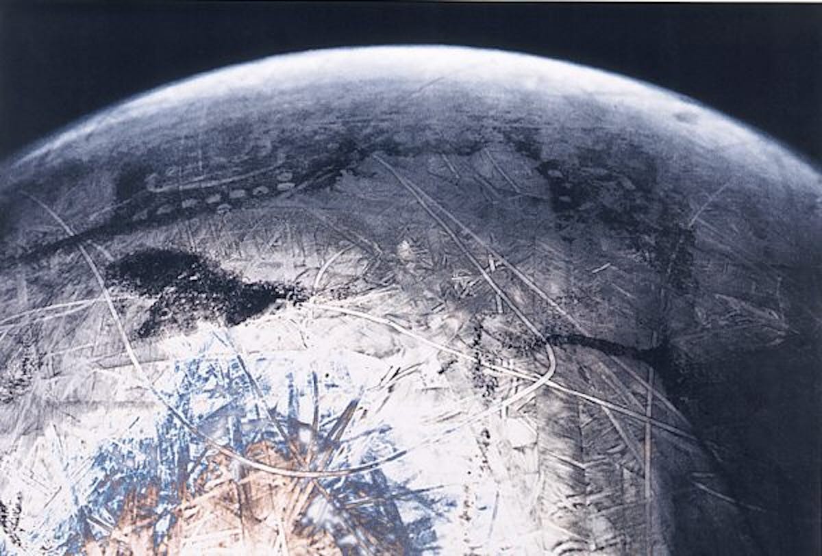 Hannes Rickli haben immer Parallelen der Erkenntnis- und Wahrheitsfindung in Kunst und Wissenschaft interessiert. Seine Installation “Spurenkugel”, aus der diese Fotografien stammen, ähnelt zwar einer wissenschaftlichen Vorrichtung zur Erzeugung gesicherter Wahrheiten, aber sie entpuppt sich als ironisches Spiel mit der Prädisposition. Hannes Rickli beschreibt seine Rauminstallation selbst: „Im abgedunkelten Raum dreht sich eine Kunststoffkugel (…) langsam um eine stabile Achse. Gesteuert werden die Motorenbewegungen von einem Computer. Besucher lösen durch Unterbrechung von Lichtschranken im Raum einen Trudelprozess der Kugel aus, indem der Zufallsgenerator jetzt die Parameter für die Drehrichtung, die Geschwindigkeit sowie die alternierende Versorgung der Motoren mit Strom ständig neu errechnet. (…) Die Kugel ist mit Graphit beschichtet und zeichnet ihre Bewegungen durch Reibung und Schleifen der drei Auflagepunkte auf die eigene Oberfläche. (…) Diesen Prozess kann man in der simultanen Grossprojektion mit verfolgen.“ Methodisch scheint hier das umgekehrte Verfahren zu Fischli Weiss am Werk zu sein: Es wird scheinbar mit der grossen Kelle angerichtet, wird ein Technopark in Betrieb gesetzt, der stärker einer wissenschaftlichen Versuchsanordnung denn einer künstlerischen Arbeit gleicht. Doch das stimmt so nicht: Weder sind die Geräte auf dem letzten Stand der Entwicklung, noch verlässt die Installation den mit Scotch-Bändern verklebten Stand der Improvisation. Ricklis „Schreibspiel“ genannte Installation ähnelt stark einer wissenschaftlichen Vorrichtung zur Erzeugung gesicherter Wahrheiten. Das wirkliche Erproben der Erkenntnismöglichkeiten wandelt sich aber zum ironischen Spiel mit der Prädisposition. Was bleibt sind Einsichten in die Relativität – und verführerisch schöne ‚Planeten‘-Bilder!