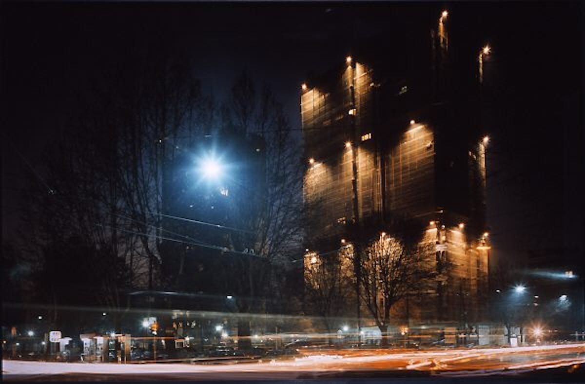 Lewis Baltz Arbeiten, die er zusammen Generic Night Cities nennt – ein- oder mehrteilige, immer grossflächige Nachtstädte – betören mit heftigen Hell-Dunkel-Mustern, mit grellen Farben, die aus dem Schwarz der Nacht hevorstechen. Sie sind ein ScheinwerferlichtSpektakel, das ebenso fasziniert und gefällt wie auch durch schrille Künstlichkeit schmerzt. „Stadtlandschaft“ nicht mehr als ein vor uns Distanziertes, sondern als vollumfänglich kommerzialisiertes Labor, in dem wir mitten drin stecken. Die Stadt als riesiges Geviert von Passagen, ein Raster von Strassen, von Highways, auf denen wir unterwegs sind und eine Reihe von Terminals, der Parkplatz, der Häuserblock und schliesslich der Bildschirm, vor dem wir haltmachen, ohne anzukommen, ohne zuhause zu sein – um gleich wieder – elektronisch – unterwegs zu sein. Stadtlandschaften bei Nacht: Kein Tageslicht gibt eine klare, hierarchisierte Ordnung vor, tausend künstliche, schrille Lichter locken und weisen. Die Stadt als Parking Lot oder Fahrspur, stop and go, ein einziges urbanes Labor. Diese Nachtlandschaften wirken wie die Bühne eines letzten grossen Spektakels. Die Bilder wirken so dünn und flächig und bunt wie Schalttafeln, die Städte wirken wie offengelegte Chips, endlose Kreisläufe, eine Maschinerie von Lust und Kraft und Macht und Untergang.