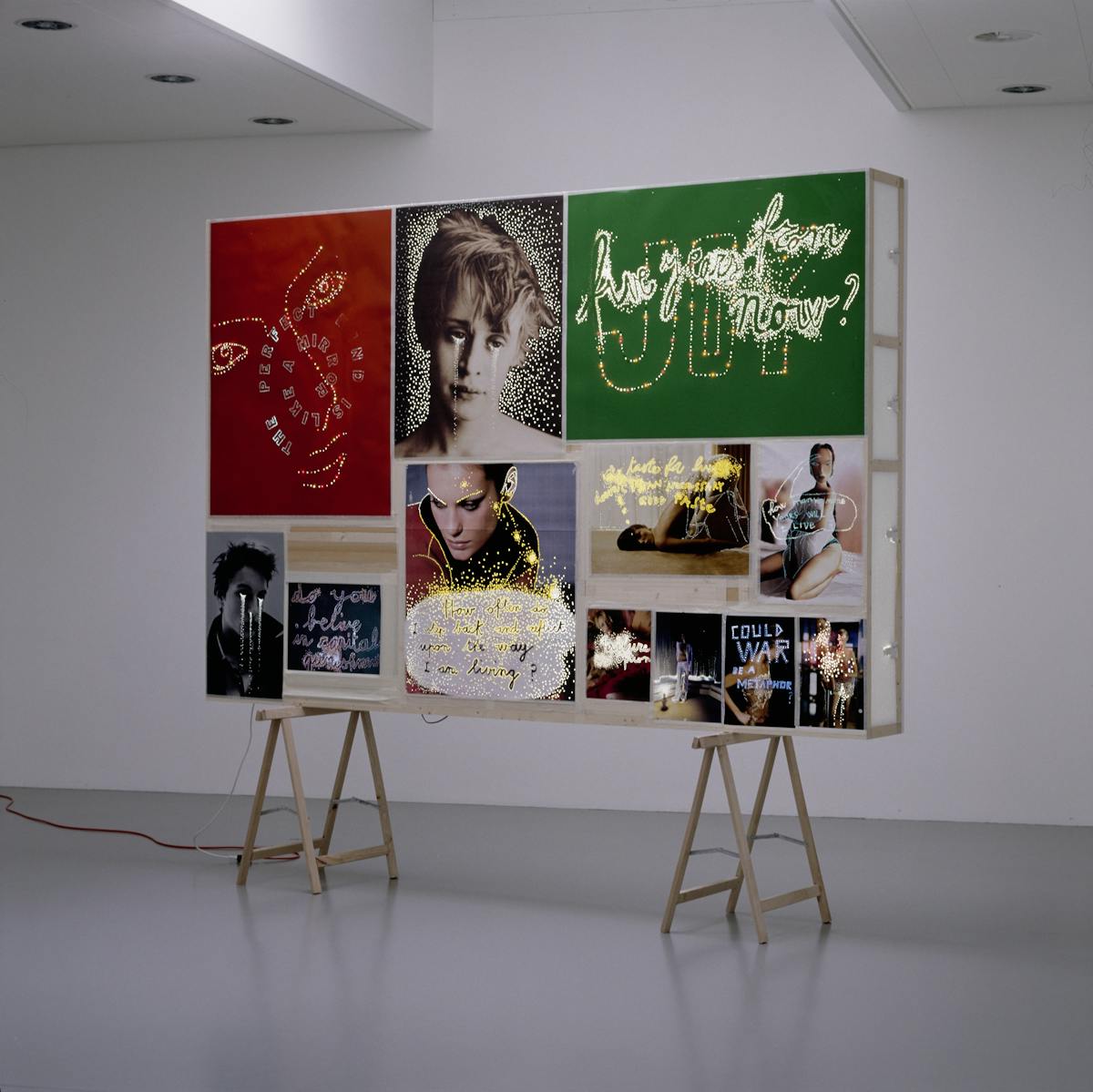 In seiner Collage „Pinnwand“ der Fotoserie Looking for Love (1994–2011) entlarvt der Schweizer Künstler Daniele Buetti das von der Werbe- und Modeindustrie vorgenommene Framing des Körpers und stellt unsere visuell getriebene Konsumgesellschaft an den Pranger. In Werbeanzeigen und Magazinbildstrecken stanzt Buetti rückseitig Markenlogos ein, fotografiert diese erneut ab und setzt die Fragmente zu einer Bildwand zusammen. In „Pinnwand“ spiegelt sich nicht nur die Kommodifizierung des jungen, sportlichen, oftmals weiblichen Körpers, der zur Ware umfunktioniert wird, sondern auch der mangelnde kritische Konsum dieser Medien-Frames durch die Rezipient_innen und die sich so wechselseitig verfestigenden Gender-Stereotypen und Schönheitsideale. Der gewaltsame Eingriff in die makellosen Aufnahmen, der an Tätowierungen erinnert, erzeugt ein Störelement in dem bis heute vorherrschenden Schönheits- und Körperkult. Dieser boomte in den 1990er-Jahren insbesondere durch das Aufkommen der sogenannten Supermodels sowie durch die zunehmende Professionalisierung von Photoshop. Er schreibt sich fort in den Social-Media-Bildern und spitzt sich zu in den Darstellungsweisen der Influencer_innen, die den Körper als Marke inszenieren und zunehmend ihre Identität über Produkte definieren.