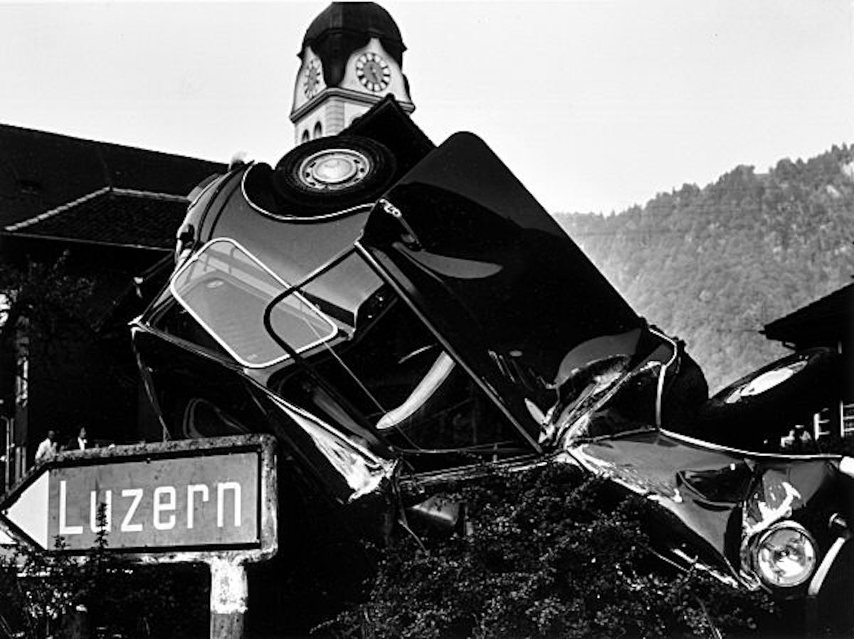 Der Polizeifotograf Arnold Odermatt hatte seinen Dienstauftrag, Unfälle zu fotografieren, mit grosser Genauigkeit und viel Sinn für das Bildhafte ausgeführt: Zwei Typen von Fotografien prägen seine „Karambolagen“: Landschaftsfotografien und fotografierte Skulpturen. Die schweizerische Landschaft mit ihren Wiesen, Bäumen und Seen, die immer ein wenig sonntäglich wirkt, wird in Odermatts Bildern unfreiwillig zu einer Bühne für Kuriosa. Eine meist sanfte, leicht schläfrige Landschaft wird an einer Stelle punktiert – peng, zwei Fahrzeuge ineinander verkeilt – oder überzogen von merkwürdigen Kratzern mit Endpunkt, einem Auto, aufgeprallt an einem Baum, einer Wand, die Abschrankung durchtrennt und halb im See gelandet. Eine Unfallstelle mitten in der Ordnung. Ein Unfall der Ordnung, gesäubert und bereits wieder „soweit geordnet“. Der zweite Typus zieht den Blickradius weit enger, fokussiert auf das Auto, ist skulptural: Nahaufnahmen von ineinander verkeilten Wagen, von aufgeschlitzten Kotflügeln, aufgerissenen Kühlerhauben, zerdepperten Scheiben. Eine Art von „unvoluntary sculptures“, von unfreiwilligen Skulpturen, entstehen durch die nüchtern, sachlich und präzis aufgenommenen Fotografien. Es ist Auftragsfotografie der fünfziger, sechziger, siebziger Jahre und als solche auch zu verstehen, doch der Wert, der Schaugenuss vor diesen Bildern gehen weit darüber hinaus.