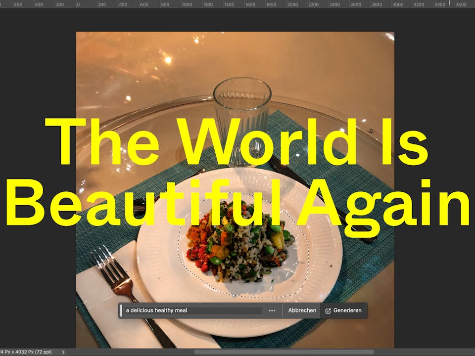 Die schöpferischen Eigenschaften dieser Bilder werden im Projekt The World Is Beautiful Again von Sebastian Schmieg und Lina Schwarzenberg untersucht. Das Projekt nimmt seinen spielerischen Ausgangspunkt im Fotobuch Die Welt ist schön (1928) des deutschen Fotografen Albert Renger-Patzsch. The World Is Beautiful Again untersucht, ob KI-generierte Bilder uns zum Nachdenken über uns selbst und unsere Umgebung anregen können: Warum sind die Dinge so, wie sie sind, und nicht anders? Welche Alternativen gibt es? Wie stark ist unsere Umwelt beeinträchtigt? Und wie können Formen der Reparatur aussehen?