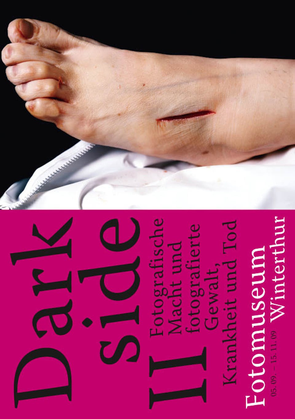 Nach der Erkundung von fotografierter Sexualität in Darkside I leuchtet das Fotomuseum Winterthur die andere Seite des körperlichen Spektrums aus: Vom integren Körper zum kranken, sich auflösenden, verfallenden, sterbenden und verwesenden Körper. Dabei stellen sich Fragen wie: Weshalb gibt es eine intime Affinität zwischen Fotografie und Tod? Weshalb zieht Gewalt die Bilder geradezu an?