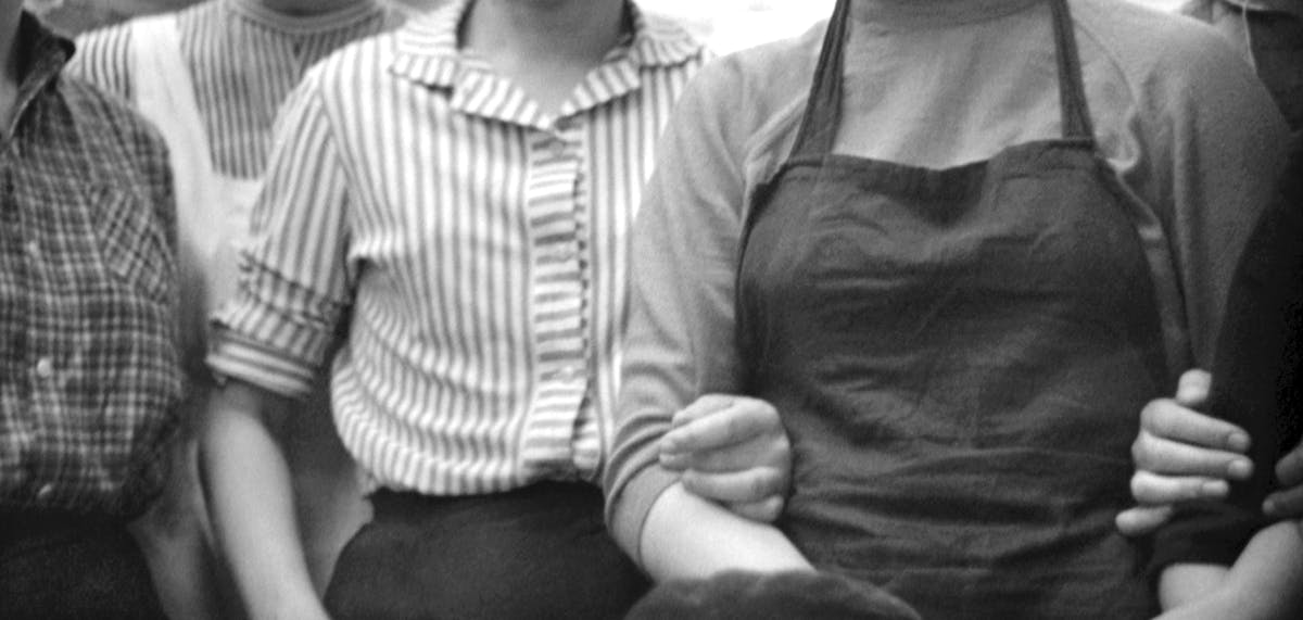 Ramona Schacht, Untitled (Die besten Weberinnen und Komsomolzinnen der Florwerkstatt (von links nach rechts): R. Medlovskaia, N. Moliar, S. Korovnik, N. Storozhenko, N. Stepanova, Y. Stepura, Darnytskyi Seiden Kombinat, Kyiv 1957, Tsdkffa, Ukraine), 2022, aus der Serie Society, Within the Work Series Pictures as a Promise (p.a.a.p.) © Ramona Schacht