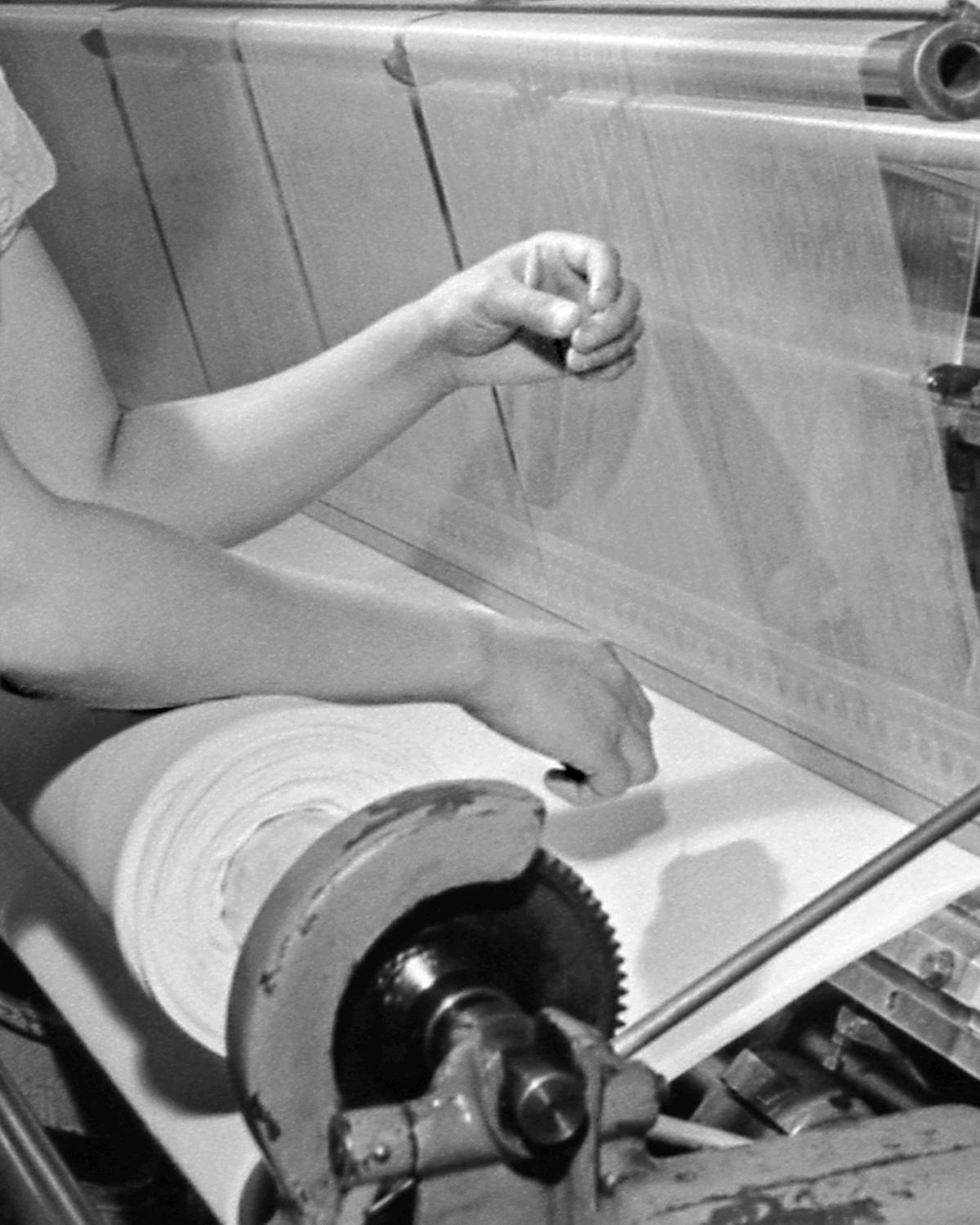 Ramona Schacht, Untitled (Strickmaschine, Ausgestattet mit einer Foto- und Elektromagnetischen Fadenabreißvorrichtung, bedient von A. Knito, Textilfabrik R. Luxemburg, Kyiv 1959, Tsdkffa, Ukraine), 2023, aus der Serie Gentle Hands, Within the Work Series Pictures as a Promise (p.a.a.p.) © Ramona Schacht