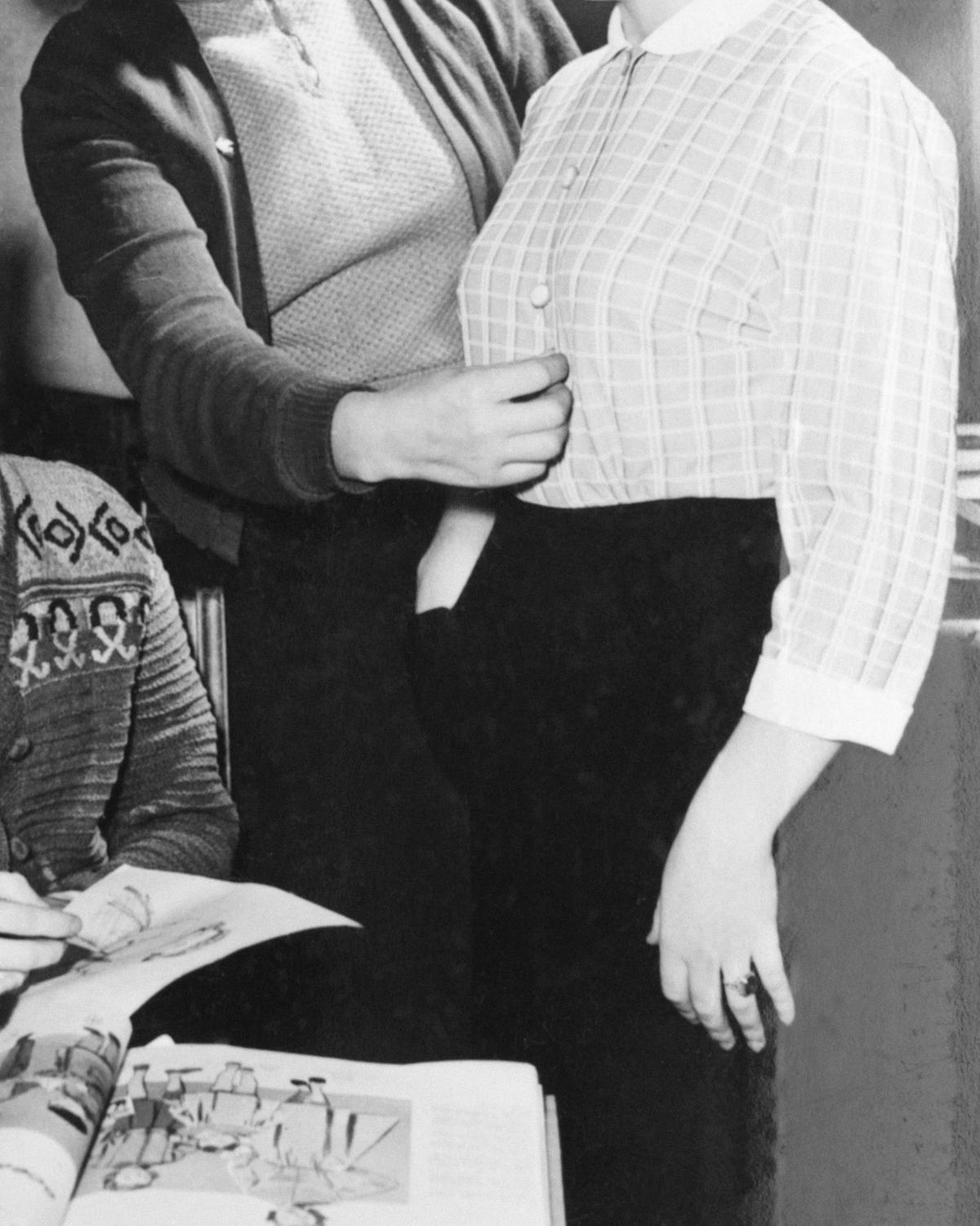 Ramona Schacht, Untitled (Mitarbeiterinnen des Textillabors: S. Rizvanova und V. Kuzmina, Modedesignerinnen, M. Kukushkina, Arbeiterin, Textilfabrik R. Luxemburg, Kyiv 1957, TsDKFFA, Ukraine), 2023, aus der Serie Instructions, Pictures as a Promise (p.a.a.p.) © Ramona Schacht