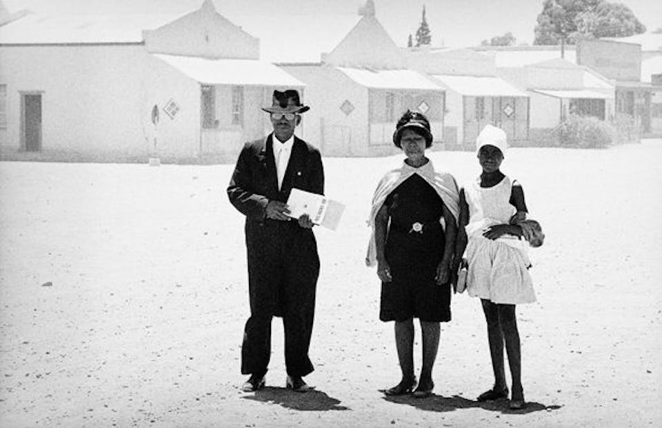 David GoldblattAn elder of the Dutch Reformed Mission Church walking home with his family after the Sunday service, Carnavon, Northern Cape. January 1968 -