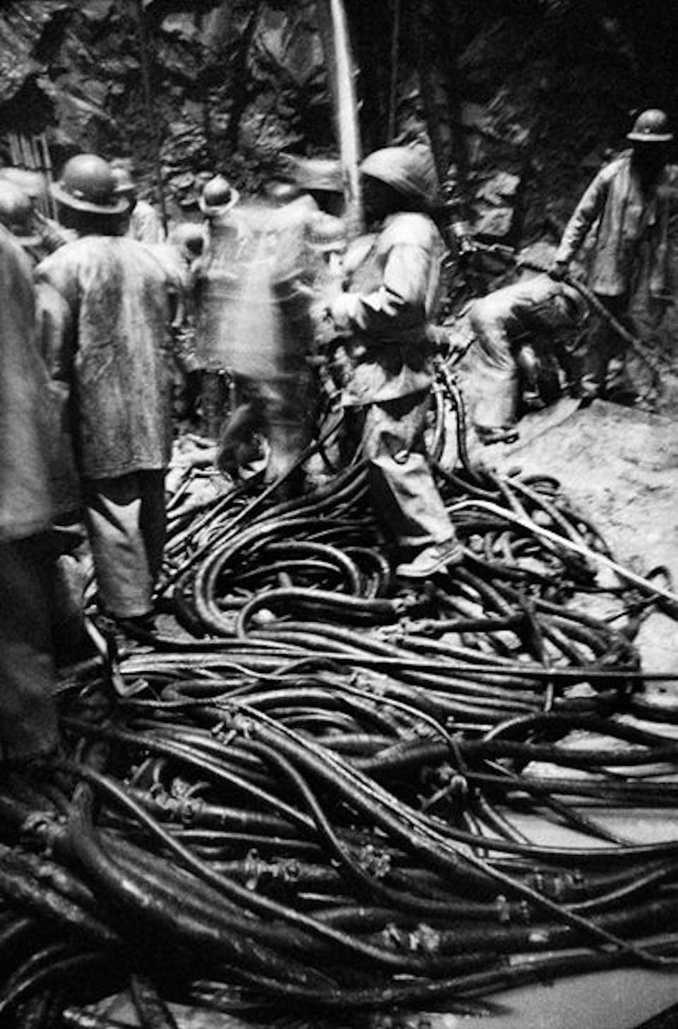 David GoldblattAir and water hoses have been lowered to the bottom and are being connected for the drilling of the blast holes, President Steyn Gold Mine, No 4 Shaft, Welkom, Free State. January 1970 -