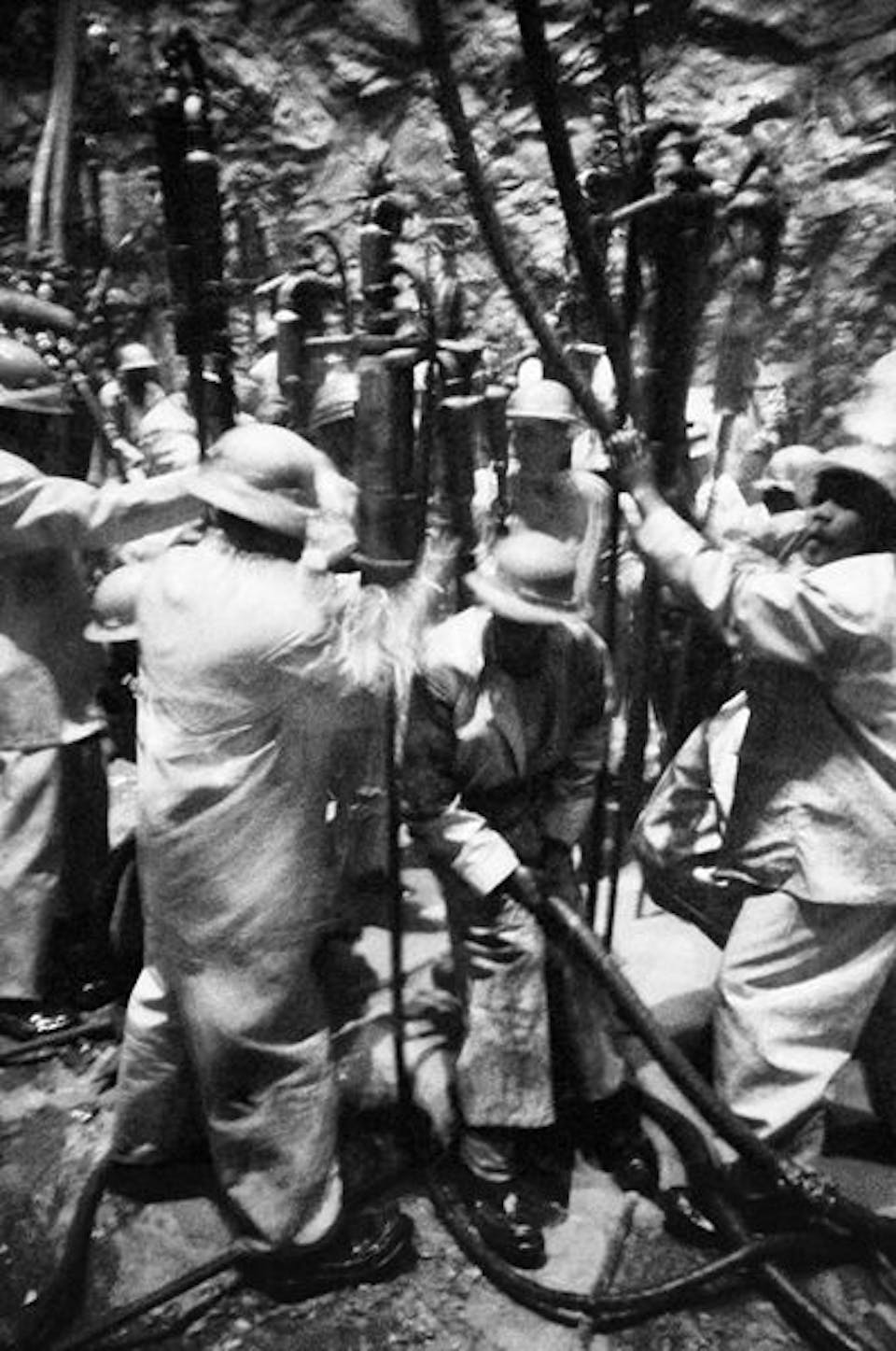 David GoldblattDrilling begins: In the ten metre diameter shaft 36 jackhammers will drill 238 holes that will be charged with explosives, President Steyn Gold Mine, No 4 Shaft, Welkom, Free State. January 1970 -