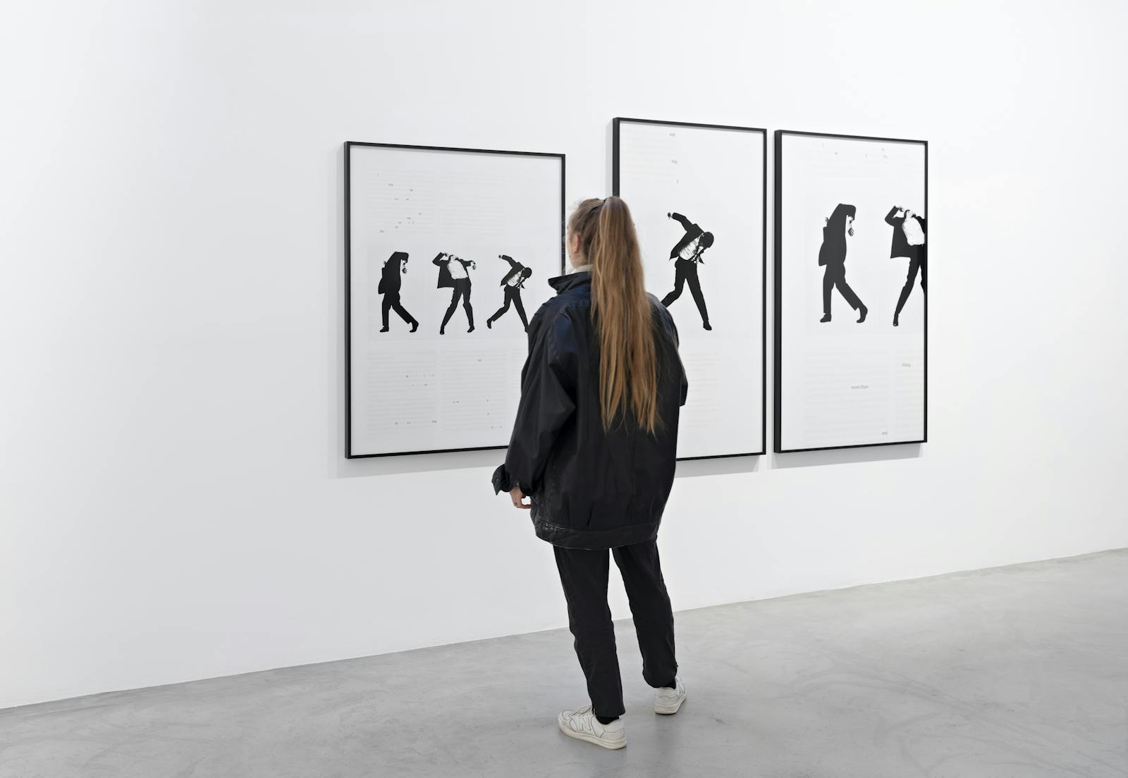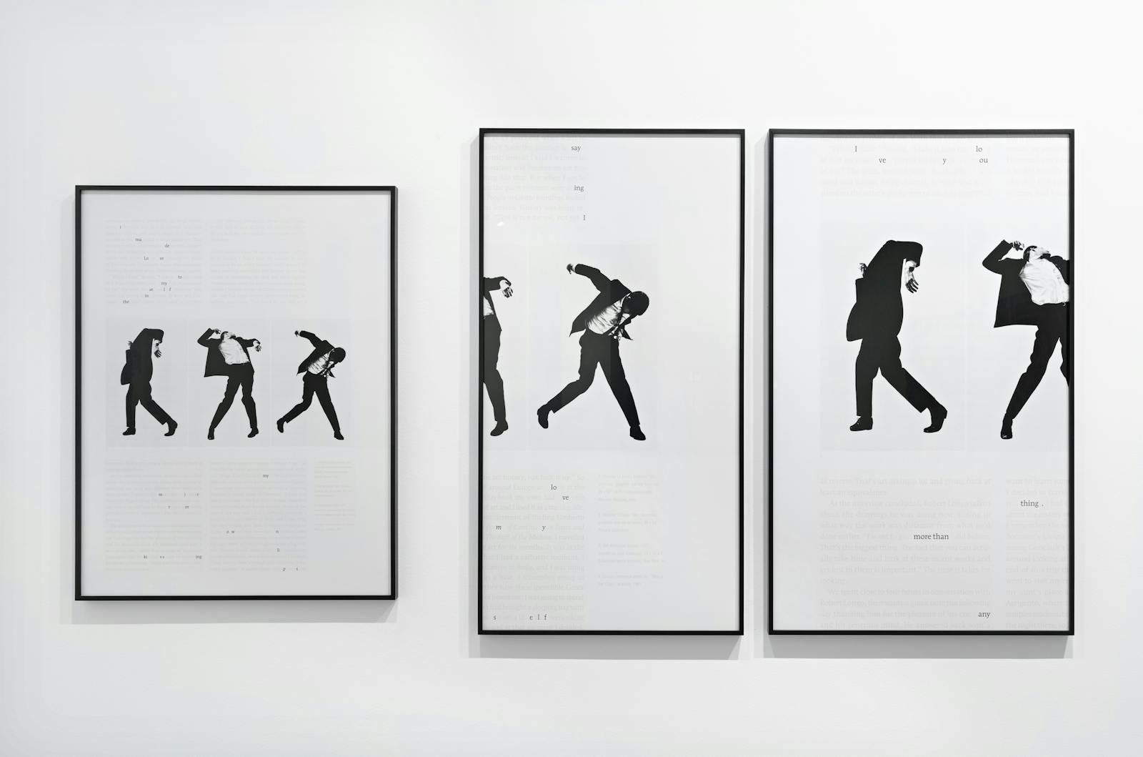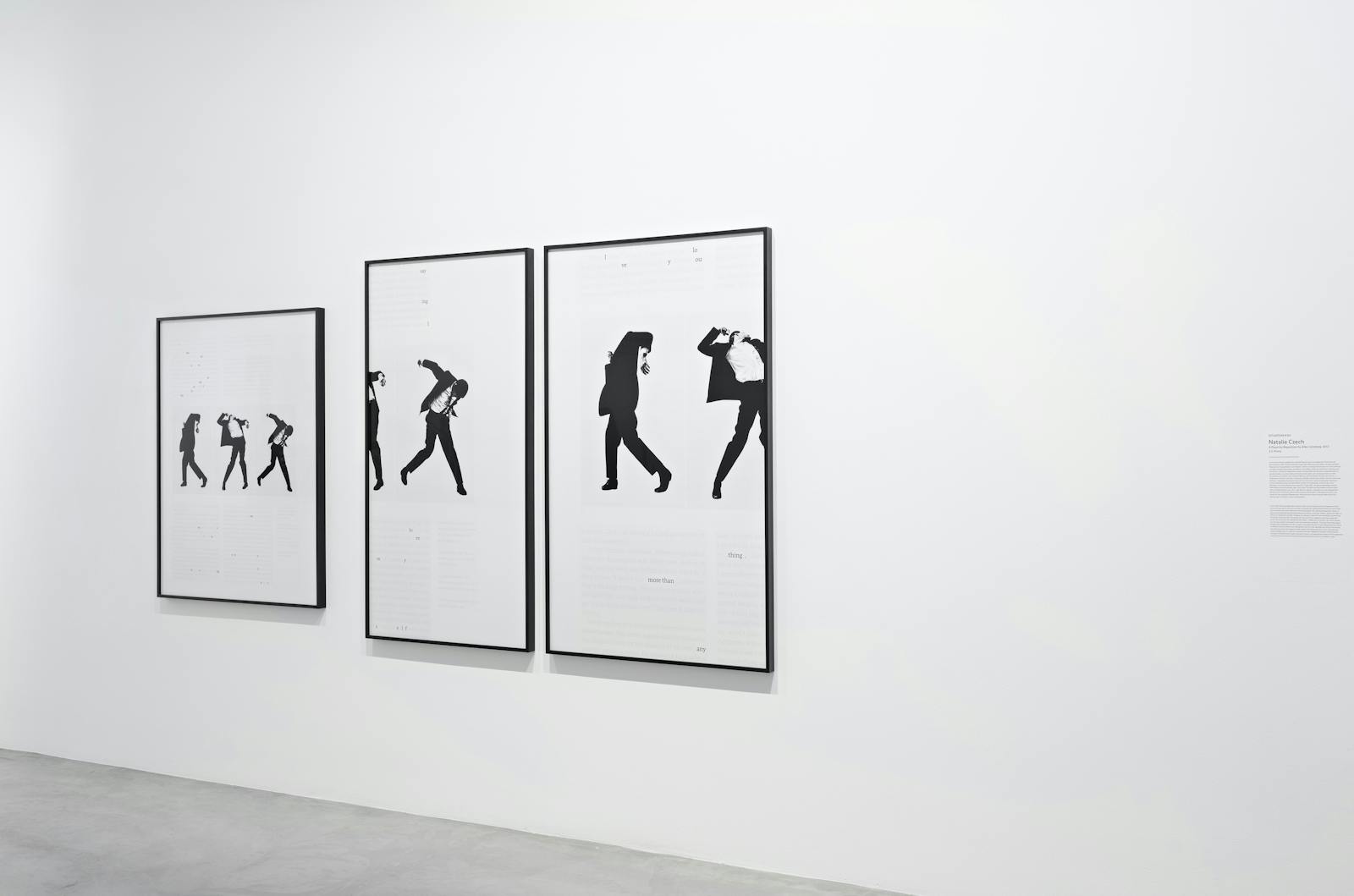 In ihrer Serie Poems by Repetition arbeitet Natalie Czech mit alltäglichen Textsorten wie Zeitschriftenartikeln, Bedienungsanleitungen oder Wörterbucheinträgen, um das poetische Potenzial des Fotografischen zu entfesseln. Indem sie fotografische Kopien der Texte anfertigt und dabei einzelne Buchstaben und Wörter hervorhebt, bringt sie „versteckte“ Gedichte zum Vorschein. In A Poem by Repetition by Allen Ginsberg lässt die Künstlerin beispielsweise nur jene Buchstaben aus einem Zeitschrifteninterview stehen, die Ginsbergs Zeilen von 1951 ausmachen, und maskiert den restlichen Beitrag. Auf drei Spalten verteilt, liest sich so: „I made love to myself in the mirror kissing my own lips, saying I love myself, I love you more than anything.“ Die gleiche illustrierte Seite wird von links nach rechts stufenweise vergrössert und verschiedene Serien von Buchstaben werden hervorgehoben, wodurch der „neue“ dekodierte Text die Integrität des Originals in Frage stellt, und die nachgebildete Version jedes Bildes einzigartig werden lässt. Durch das Freistellen der Buchstaben eröffnet Czech mehrere Möglichkeiten, den Text in den Blick zu nehmen. Losgelöst von ihren anfänglichen semantischen Funktionen scheinen die schwarzen Buchstaben in Bewegung versetzt, was visuell mit den exzessiven Bewegungen der berühmten schwarz-weissen Men in the City-Zeichnungen von Robert Longo korrespondiert.