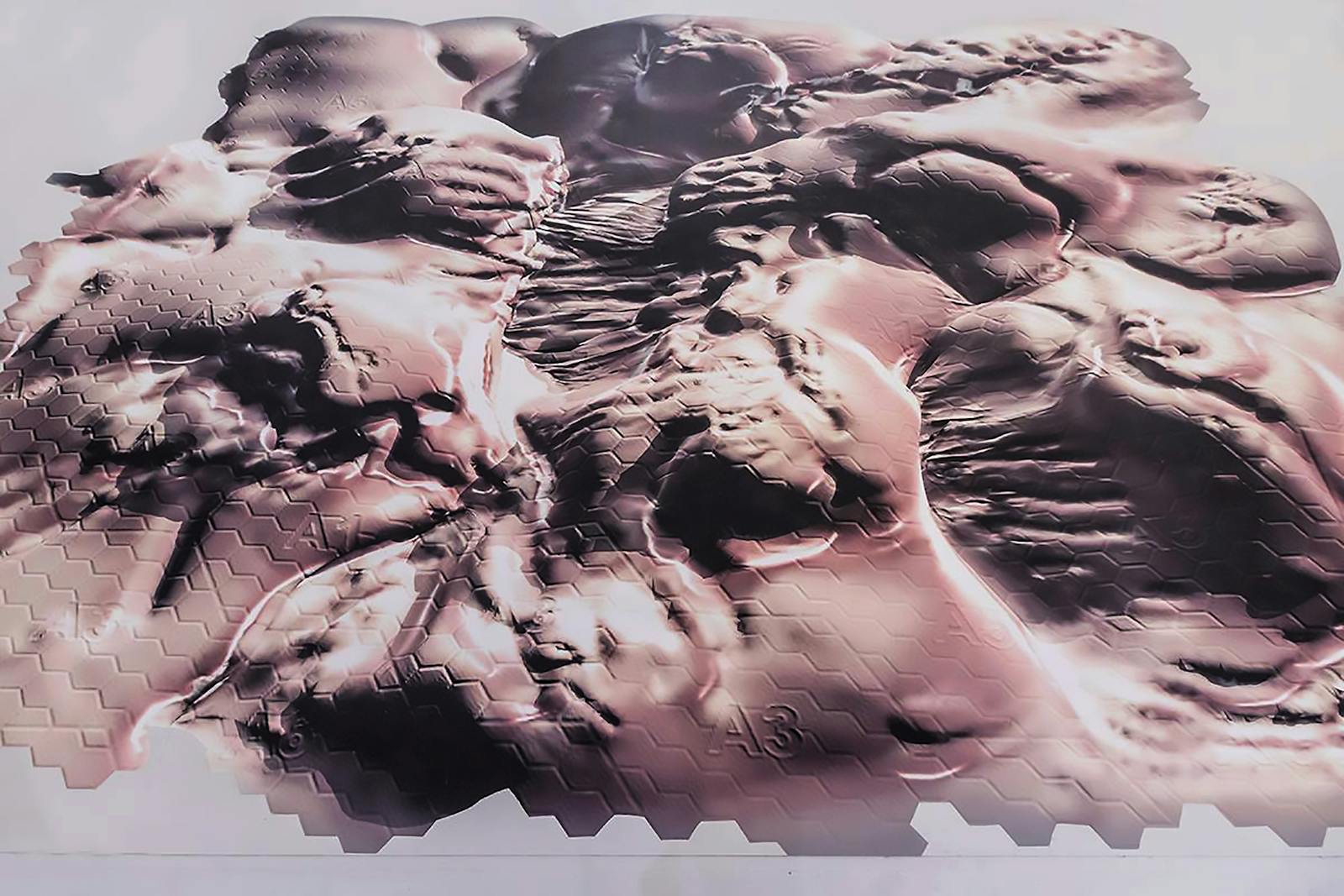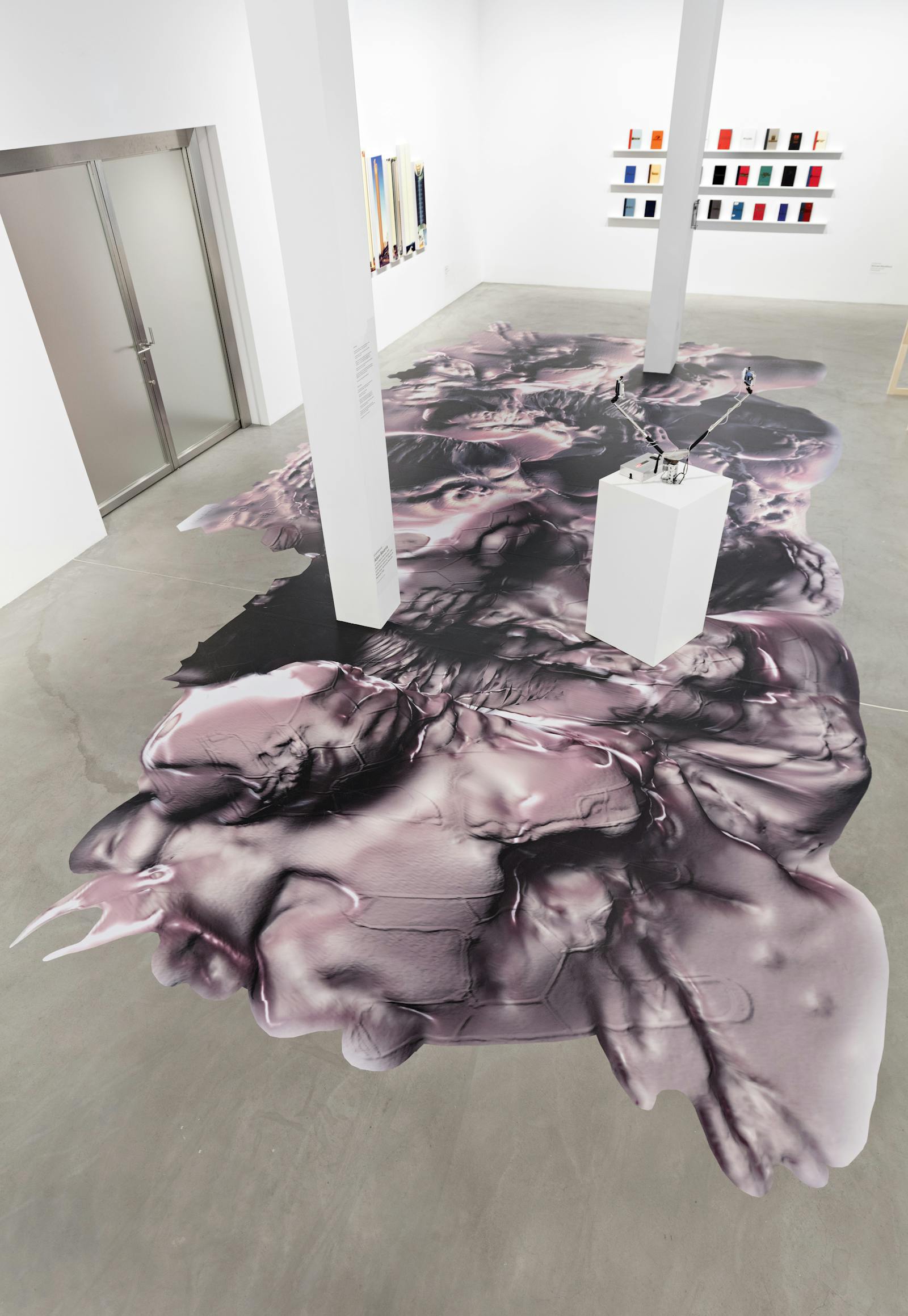 Feldspar – Hadal Zone bezieht sich sowohl auf die Tiefsee als auch die Erdoberfläche: Feldspat ist eine Gruppe gesteinsbildender Minerale, die den Grossteil der Erdkruste ausmachen, während man als hadale Zone die tiefsten Gräben der Weltmeere bezeichnet, benannt nach dem Hades, der Unterwelt in der griechischen Mythologie. In Joey Holders Arbeit werden beide Sphären zu einem unregelmässigen und undefinierbaren visuellen Gebilde verschmolzen, das fast den gesamten Boden der Ausstellung bedeckt. Aber was hat die Tiefsee mit der Erdoberfläche gemeinsam? Holders Versuch, eine Karte von Gebieten zu entwerfen, von denen der Mensch äusserst wenig weiss, zeigt nicht nur die Grenzen unserer Kartierungssysteme auf, sondern auch die der Wissenschaft und Technologie allgemein. Die Enttäuschung über das Scheitern bezieht sich auf die Erwartungen, die durch das teleologische Narrativ wissenschaftlichen und technologischen Fortschritts geweckt werden – verstanden als die menschliche Fähigkeit, Instrumente zu erfinden, die unsere Möglichkeiten stetig erweitern, die Welt, in der wir leben, zu erforschen, zu kartografieren und abzubilden. So bleibt uns einzig die Vorstellungskraft, um dem Unbekannten zu begegnen.