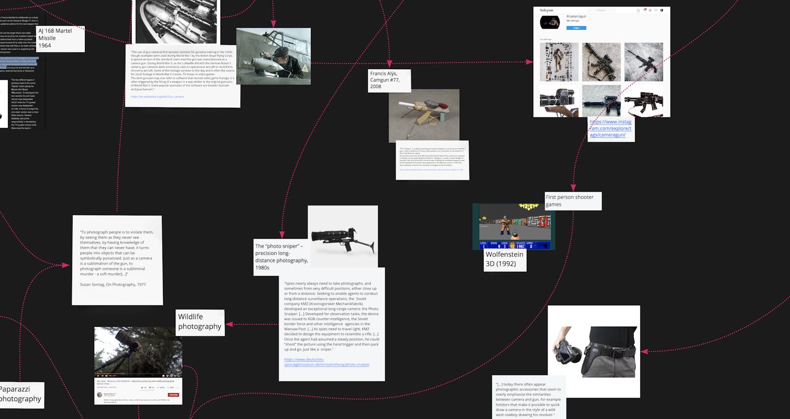 Aufgrund sich überschneidender Interessen haben sich Waffen und Kameras sowohl in optischen als auch in algorithmischen fotografischen Systemen oft einen gemeinsamen Raum geteilt. Ein Grossteil des Jargons rund um den fotografischen Akt wird aus der militärischen Terminologie abgeleitet, wie z.B. das „bewaffnete Auge“ für Hilfsmittel zur optischen Vergrösserung, das „Laden“ oder „Entladen“ des Films sowie das „Zielen und Schiessen“ mit der Kamera. Darüber hinaus sind die Technikgeschichte der Fotografie und die des militärischen Komplexes eng miteinander verflochten – von Kameras, die in der Kampfausbildung eingesetzt wurden, bis hin zu Fotosafaris, die den Akt des Jagens sublimieren, von der Luftaufklärung bis hin zu algorithmischen Systemen in Drohnen und Überwachungskameras, die zur Identifizierung von Feinden und Protestierenden eingesetzt werden. Die hier präsentierte Online-Mindmap ist ein vom kuratorischen Team des Fotomuseum Winterthur erstelltes Research-Board, das diese wechselseitige Beziehung entlang verschiedener Entwicklungslinien des Apparats abbildet – von den fotografischen Praktiken des 19. Jahrhunderts bis hin zu zeitgenössischen Bildgebungssystemen.