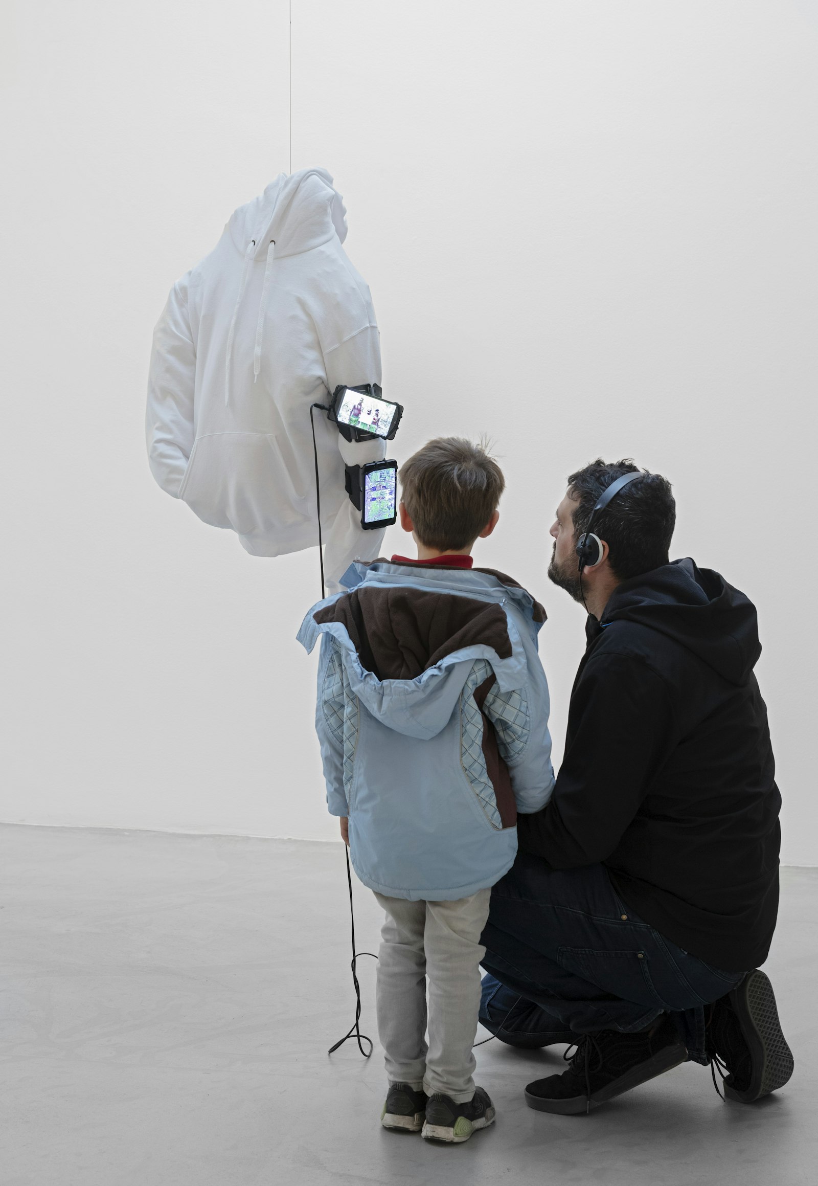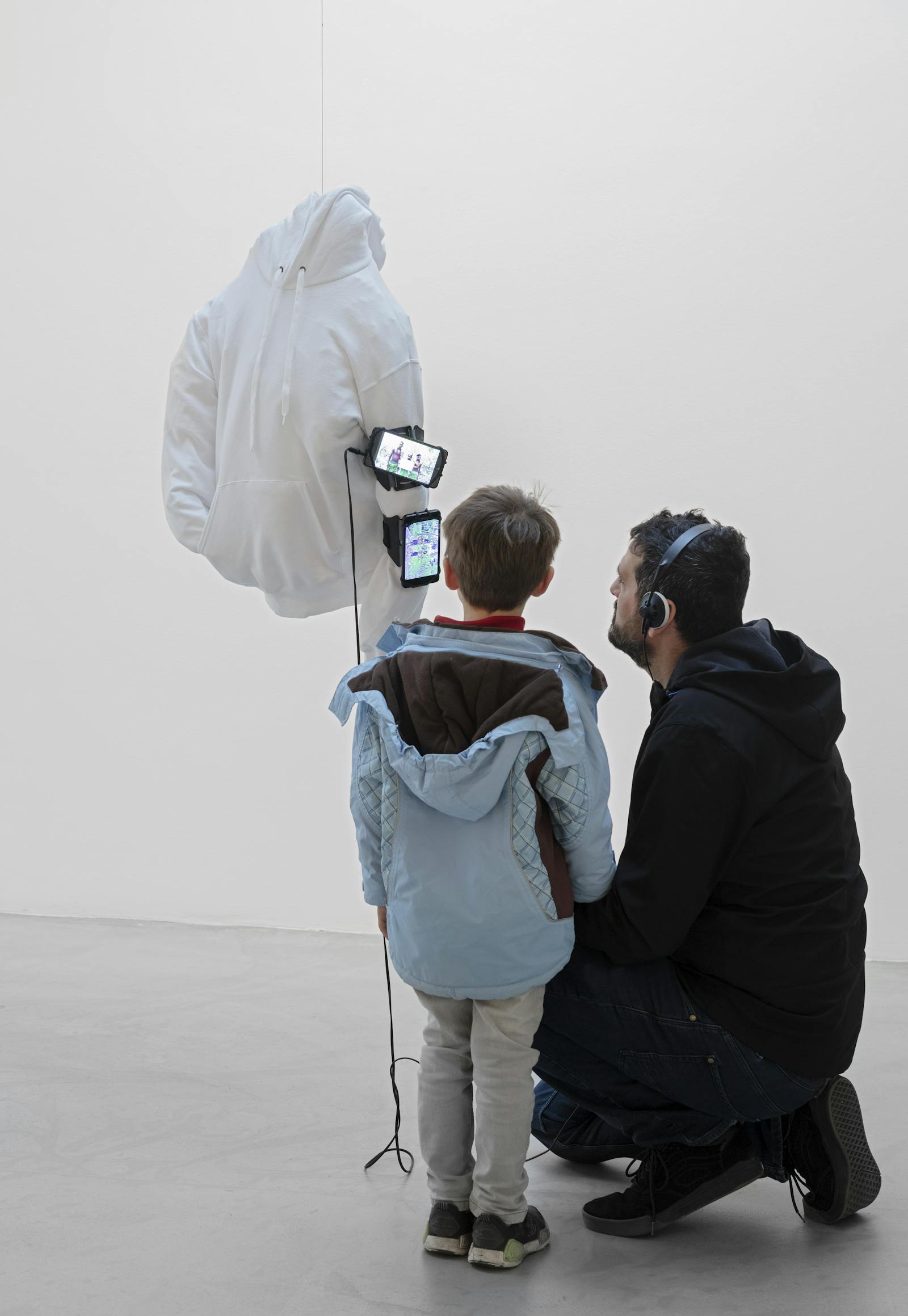 Fiverr.com ist eine der vielen Onlineplattformen, auf denen die sogenannte Gig Economy beruht. Zu Preisen ab fünf Dollar bieten hier digitale Freiberufler_innen Dienstleistungen aller Art an – vom Social Media Marketing bis zur Finanzbuchhaltung, vom Logodesign bis zu Voiceover-Tonaufnahmen. Für Hopes and Deliveries hat Sebastian Schmieg eine Sicherheitslücke der Plattform genutzt, um Tausende von Videos, die von Gig-Arbeitskräften für ihre Kundschaft produziert wurden, herunterzuladen. Die Videos werden in der Installation auf zwei Smartphones gezeigt, die an einem Pullover befestigt sind und die geisterhafte Präsenz des Körpers in der neoliberalen Arbeit einer „menschlichen Cloud“ heraufbeschwören – fern von traditionellen Arbeitsplätzen und dennoch rund um die Uhr für die Kund_innen verfügbar. Die Bilder visualisieren die Ergebnisse des prekären Unternehmertums dieser vernetzten Arbeitskräfte, ebenso wie die Wünsche einer globalen Internetkundschaft. Darüber hinaus macht die Installation den harten Wettbewerb sichtbar, der eine Art „Überlebenskreativität“ hervorbringt, wie es der Künstler nennt: die fortwährende Produktion von Ideen, um im Konkurrenzkampf dieses global vernetzten Marktes bestehen zu können.