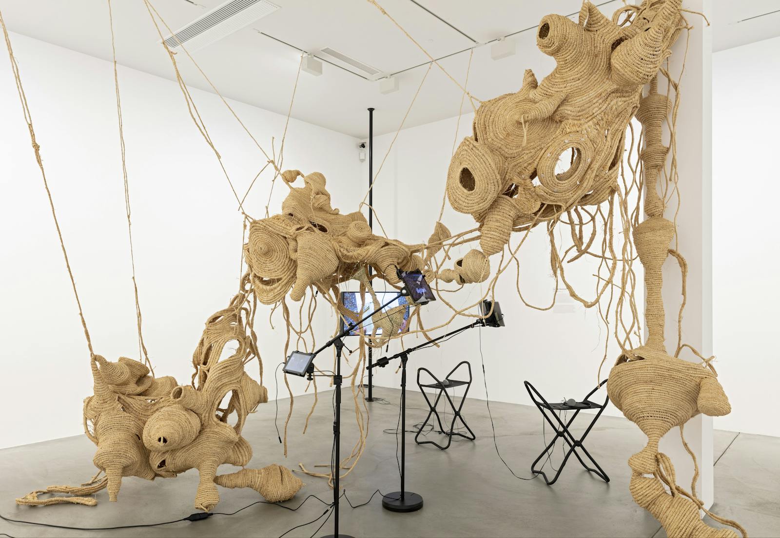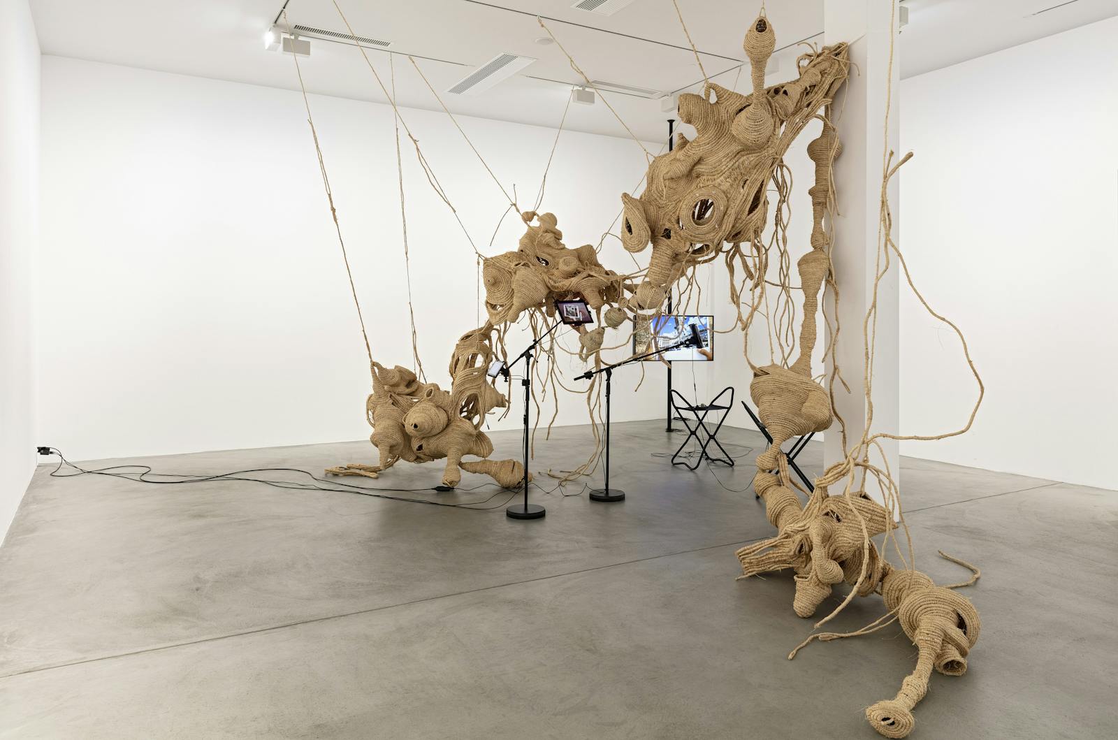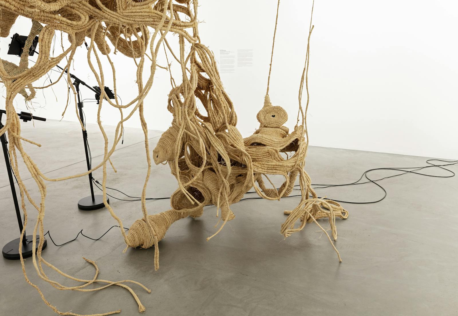 Zentral für den Entstehungsprozess der Rauminstallation thulhu thu thu, before the sun harms you war eine nekropolitische Betrachtung, d.h. von sozialen und politischen Machtstrukturen, die die Lebensweise von Menschen und sogar deren Recht auf Leben diktieren. Mit Blick auf Europas grösste Moorlandschaft in den schottischen Highlands adaptierten knowbotiq für ihre in mehreren Community-Workshops aus Raffiapalmfasern geknüpfte Arbeit den für Moorlandschaften zentralen Prozess der Sedimentierung – der Ablagerung und Schichtung von Teilchen von Flüssigkeiten und Gasen im Boden. thulhu thu thu, before the sun harms you zeigt so Strategien der kollektiv vollzogenen, sinnlichen (Wieder-)Aneignung auf, die die Repräsentation von Landschaft – in ihrer Unfertigkeit und Unabschliessbarkeit – aus einer postkolonialen Haltung heraus zu reorganisieren vermögen.