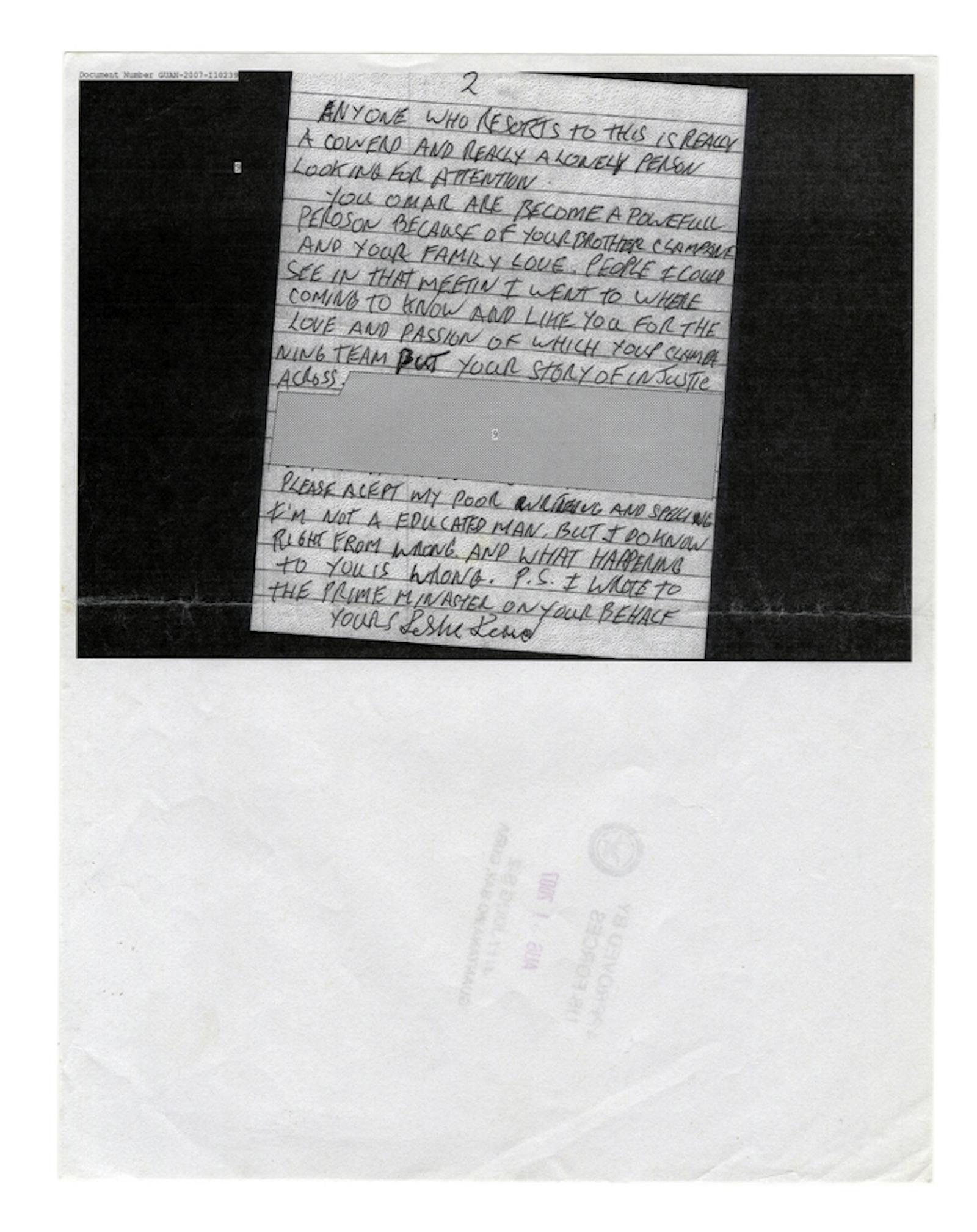 In Letters to Omar untersucht Edmund Clark die strengen Überwachungs- und Kontrollmechanismen im Gefangenenlager Guantanamo. Die Arbeit besteht aus Postkarten und Briefen, die der britische (und zu Unrecht verurteilte) Häftling Omar Deghayes während seiner sechsjährigen Gefangenschaft von Familienangehörigen, seinem Anwalt und von fremden Menschen aus der ganzen Welt erhalten hat. Damit sich keine gefährlichen Substanzen einschleichen können, wird in Guantanamo alles gescannt – jede einzelne Seite, jedes Dokument, selbst die Rückseiten von Couverts werden gescannt und erhalten einen offiziellen Stempel und eine Referenznummer. Die Originalbriefe und Karten hat Omar nie gesehen; nur die im bürokratischen Prozess kopierten, kontrollierten, zensierten Dokumente bilden seine Brücke zu einer Aussenwelt, die mit jeder Reproduktion und jedem Eingriff abstrakter wird und weiter entfernt rückt – und so gezielt zu einer mentalen Verfremdung und Desorientierung des Häftlings führen soll.
