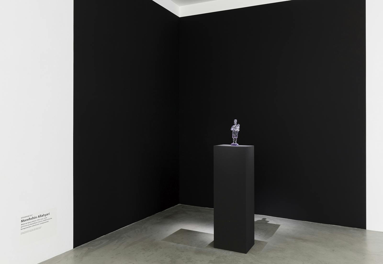 Für Morehshin Allahyari ist die 3D-Drucktechnologie sowohl Werkzeug für eine alternative Form der Archivierung wie auch Mittel des politischen Widerstands und der Dokumentation. In ihrer Serie Material Speculations: ISIS rekonstruiert die Künstlerin historisch bedeutende kulturelle Artefakte, die von ISIS im Jahr 2015 zerstört wurden. Aufgrund des umfangreichen Sammelns und Erforschens von Bildern und Dokumenten der zerstörten Objekte ist Allahyari in der Lage, ein 3D-Modell des Artefakts zu rekonstruieren und als Skulptur zu drucken. Für den Rekonstruktionsprozess werden Fotografien, Dokumente, Karten und Videos herangezogen. Die gesamte Dokumentation, die sie über das zerstörte Artefakt zusammenträgt, wird auf einem in die 3D-Arbeit eingebetteten Datenträger gespeichert. Das Bild, das die Künstlerin damit erstellt, hört nicht auf zu existieren – es wird im Gegenteil unendlich reproduzierbar. Material Speculations definiert Begriffe wie Materialität neu und zwingt uns, die Vorstellung der Einmaligkeit des historischen Bildes und Artefakts zu überdenken. Schliesslich erforscht Material Speculations die politische und poetische Beziehung zwischen 3D-Druck, Kunststoff, Öl, Technokapitalismus und dem Dschihad.