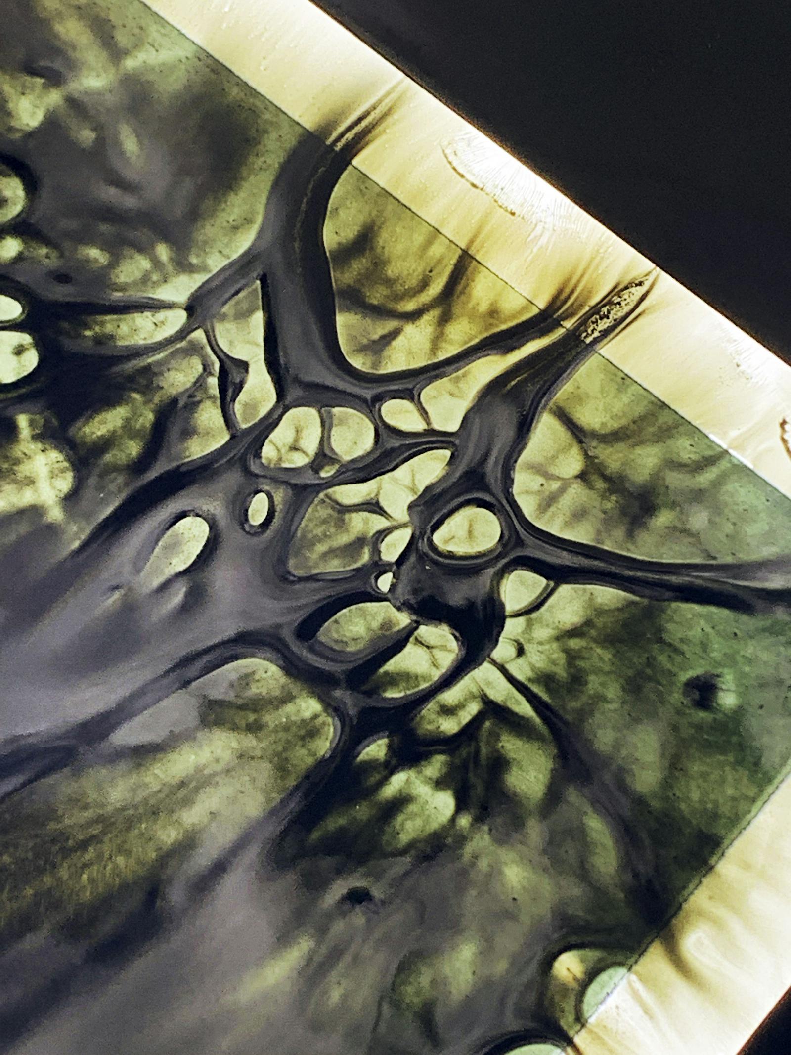 Während Jean-Vincent Simonet in seiner neuesten Serie Mechanical Paintings (2018–) seine exzessive und ekstatische Bildsprache weiter vorantreibt, steht vor allem ein aufwändiges Experimentieren mit Drucktechniken im Vordergrund. In einem mühevollen, künstlerisch-forschenden Arbeitsprozess tüftelt Simonet an Digitaldruckern und greift auf verschiedenste Papiere, Tinten, Epoxide und anderen Chemikalien zurück. Dabei erzeugt er visuelle Formen, die von der Besessenheit getrieben sind, das eigentliche Ziel des Druckverfahrens – nämlich das der endgültigen Fixierung – zu unterwandern. In ihrer Objekthaftigkeit gleichen die Mechanical Paintings synthetisch erzeugten lebenden Organismen; mit ihrem unbändigen Trieb, unfixiert und unvollendet zu bleiben, verweisen sie auf die hybride Bildrealität des 21. Jahrhunderts, die oft einem Exzess gleicht.