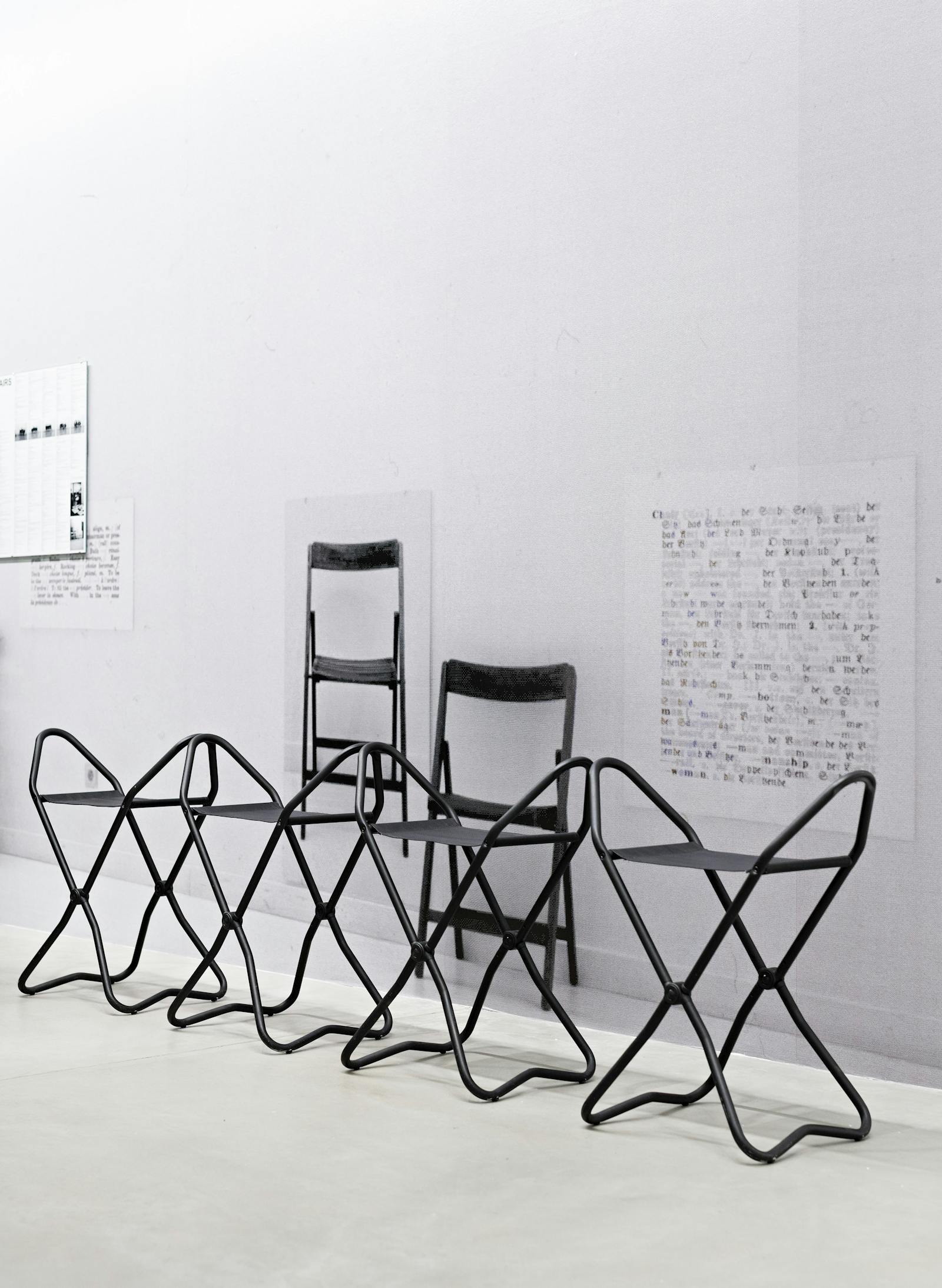 Die Performance- und Installationsarbeit One and Three Chairs von Michael Riedel ist eine Serie von potenziell unendlichen Re-enactments. Ausgangslage bildet das gleichnamige Werk von Joseph Kosuth aus dem Jahr 1965, eine der wegweisenden Arbeiten der amerikanischen Konzeptkunst. Kosuth präsentierte einen Stuhl auf drei verschiedene Arten: als fabrizierter Stuhl und damit als Objekt, als fotografische Abbildung, sowie als typografisches Abbild des Begriffs „Stuhl“, kopiert aus einem Wörterbuch. Damit befragte er das Bedeutungsverhältnis der Objekte und Begriffe, wie es die Sprachwissenschaft in ihrer Zeichentheorie reflektierte.