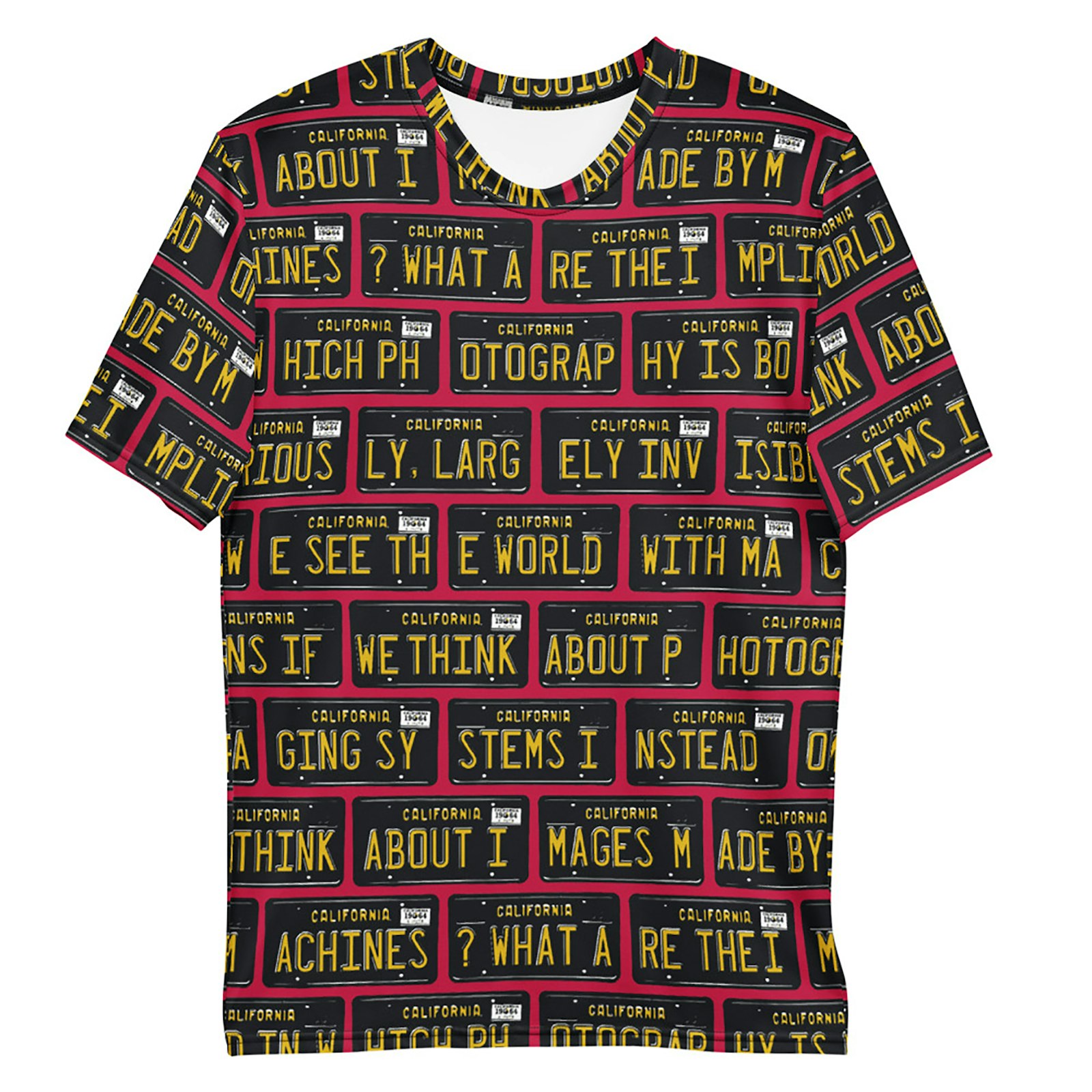 Anstelle blosser Zahlen, ziert folgendes Zitat des US-amerikanischen Fotografen und Autoren Trevor Paglen aus seinem Still Searching...-Blogbeitrag „Is Photography Over?“ die auf dem T-Shirt aufgedruckten Nummernschilder: