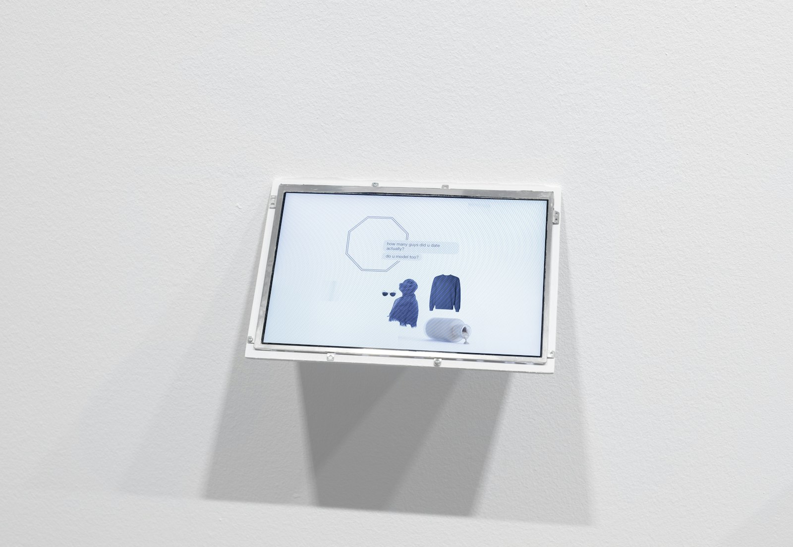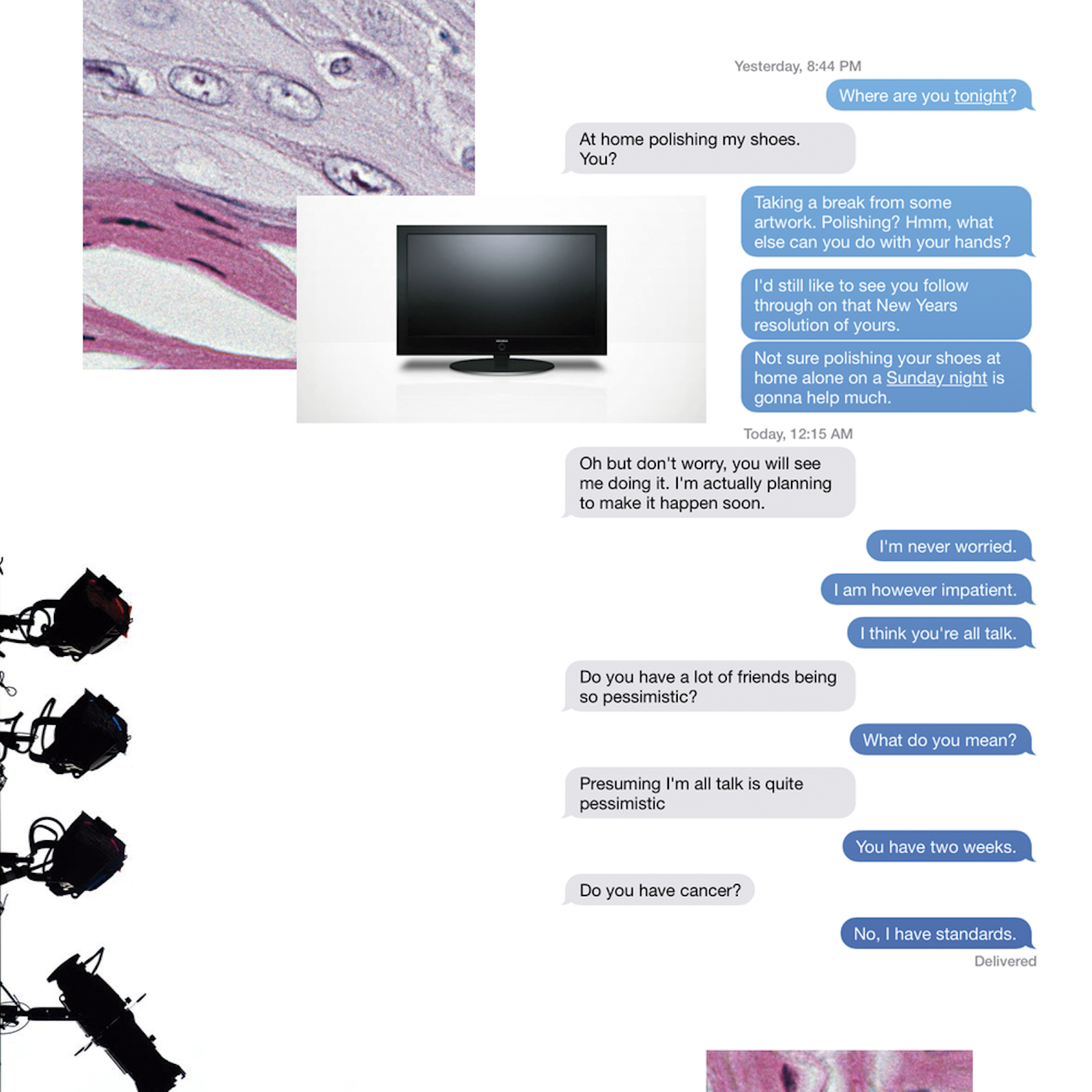 Shawné Michaelain Holloways Serie text(s) to screen beschäftigt sich mit den Themenfeldern Begehren, Ablehnung und Missbrauch im Zeitalter des digitalen (Online-)Datings. Auszüge aus Instant-Messaging-Chats ihrer Geliebten setzt Holloway mit Bildern, die aus Werbung, Stockfoto-Datenbanken oder Word-ClipArt stammen könnten, zu digitalen, spannungsgeladenen Collagen zusammen. Die Betrachter_innen werden in eine fiktive Spurensuche verwickelt, die auf Basis textlicher und visueller Anspielungen – sei es nun auf erotischer, ironischer oder aggressiver Ebene – zu keiner eindeutigen Interpretation der aufgeworfenen Szenarien kommen kann. Holloway entlarvt so die Gefahr von Missverständnissen und Konfliktpotenzialen, die die digitale, vorrangig text- und bildbasierte Kommunikation in sich birgt. Problematiken wie das Ausloten von Macht, der emotionale Thrill sowie der potenzielle Suchtfaktor digitaler Kommunikationsformen werden in text(s) to screen gespiegelt und vor dem Hintergrund eines unkritischen Konsums von Bildern und Textnachrichten sowie ihre Interdependenzen befragt.