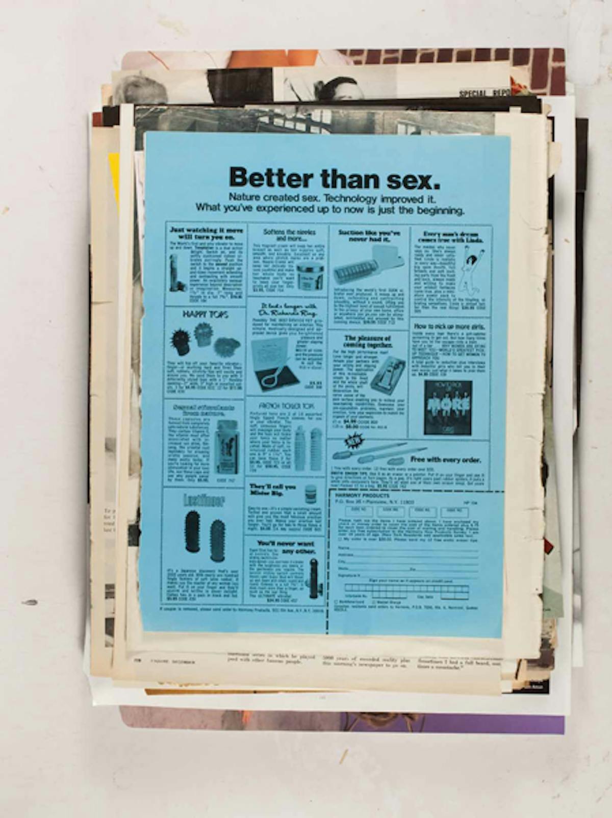 New York conceptual artist Leigh Ledare documents the zeitgeist from the 1960s/70s through the present in his Ephemeras project, which was realized as part of his work Double Bind (2010). The series is essentially a personal archive that Ledare compiled over the years from magazines and other printed sources. A total of 480 pages were reproduced in 6 magazines of 80 pages each. The individual images, which consist primarily of images from fashion, classified ads, excerpts from magazine articles, and pornography do not seem to be arranged in any particular order or share a common context. Like a multifaceted collage, a fragment of an advertisement for children’s toys follows a pornographic image from 1970. Ledare, who worked for several years as an assistant to Larry Clark, gained international recognition with his project Pretend You’re Actually Alive (2008) – a controversial series about his Oedipal relationship with his mother.