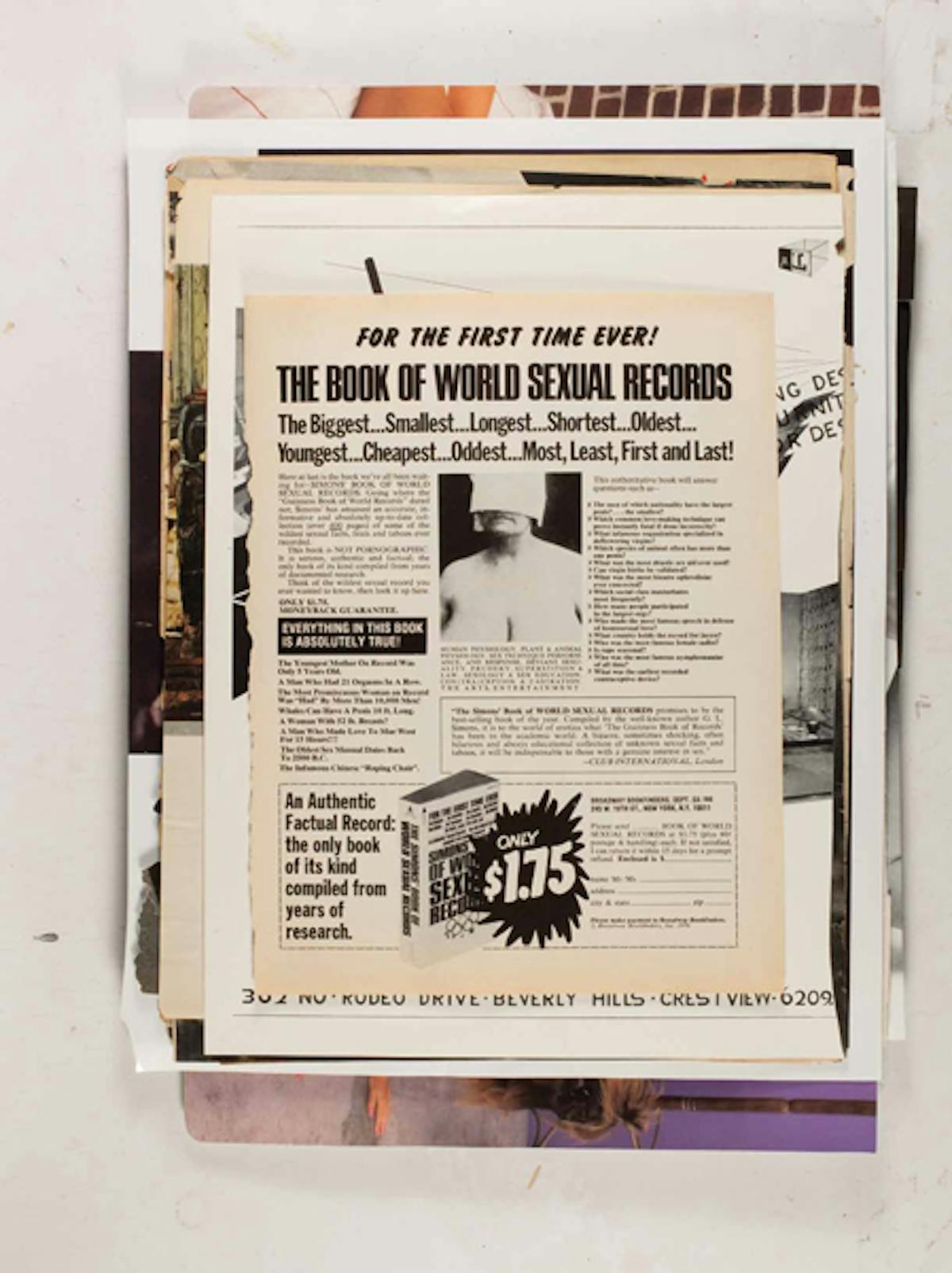 New York conceptual artist Leigh Ledare documents the zeitgeist from the 1960s/70s through the present in his Ephemeras project, which was realized as part of his work Double Bind (2010). The series is essentially a personal archive that Ledare compiled over the years from magazines and other printed sources. A total of 480 pages were reproduced in 6 magazines of 80 pages each. The individual images, which consist primarily of images from fashion, classified ads, excerpts from magazine articles, and pornography do not seem to be arranged in any particular order or share a common context. Like a multifaceted collage, a fragment of an advertisement for children’s toys follows a pornographic image from 1970. Ledare, who worked for several years as an assistant to Larry Clark, gained international recognition with his project Pretend You’re Actually Alive (2008) – a controversial series about his Oedipal relationship with his mother.