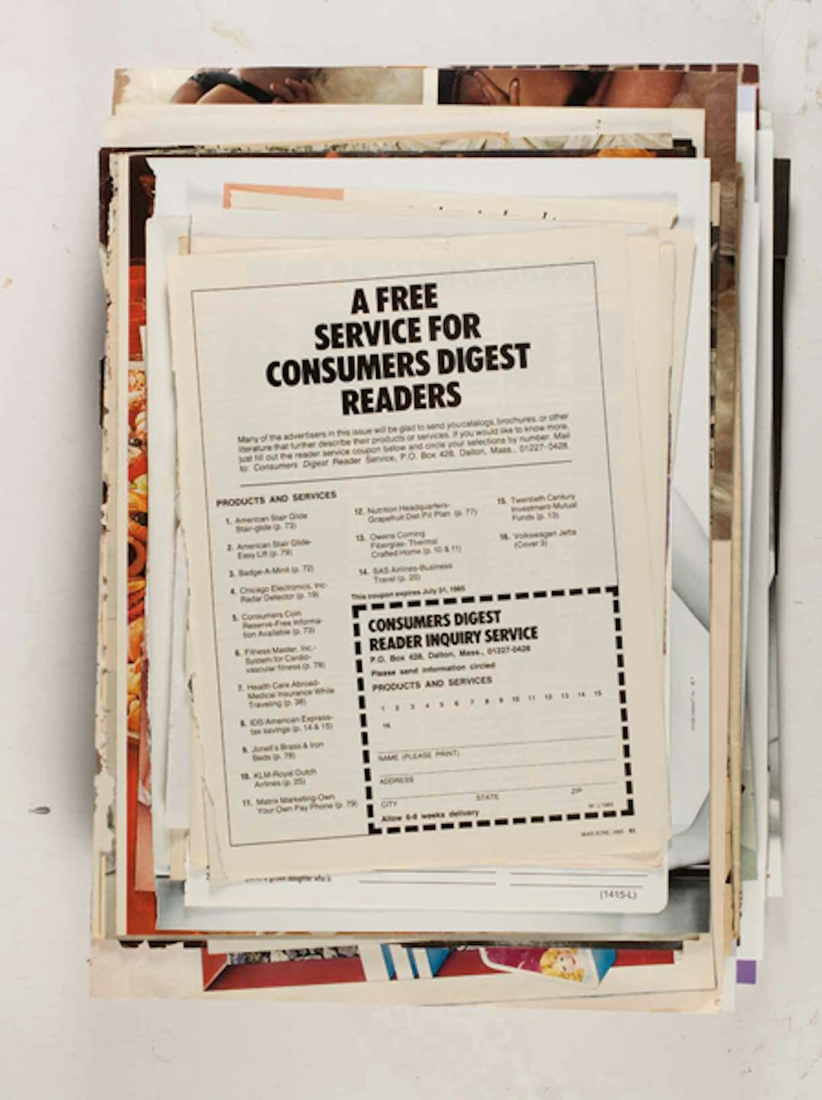 New York conceptual artist Leigh Ledare documents the zeitgeist from the 1960s/70s through the present in his Ephemeras project, which was realized as part of his work Double Bind (2010). The series is essentially a personal archive that Ledare compiled over the years from magazines and other printed sources. A total of 480 pages were reproduced in 6 magazines of 80 pages each. The individual images, which consist primarily of images from fashion, classified ads, excerpts from magazine articles, and pornography do not seem to be arranged in any particular order or share a common context. Like a multifaceted collage, a fragment of an advertisement for children’s toys follows a pornographic image from 1970. Ledare, who worked for several years as an assistant to Larry Clark, gained international recognition with his project Pretend You’re Actually Alive (2008) – a controversial series about his Oedipal relationship with his mother.
