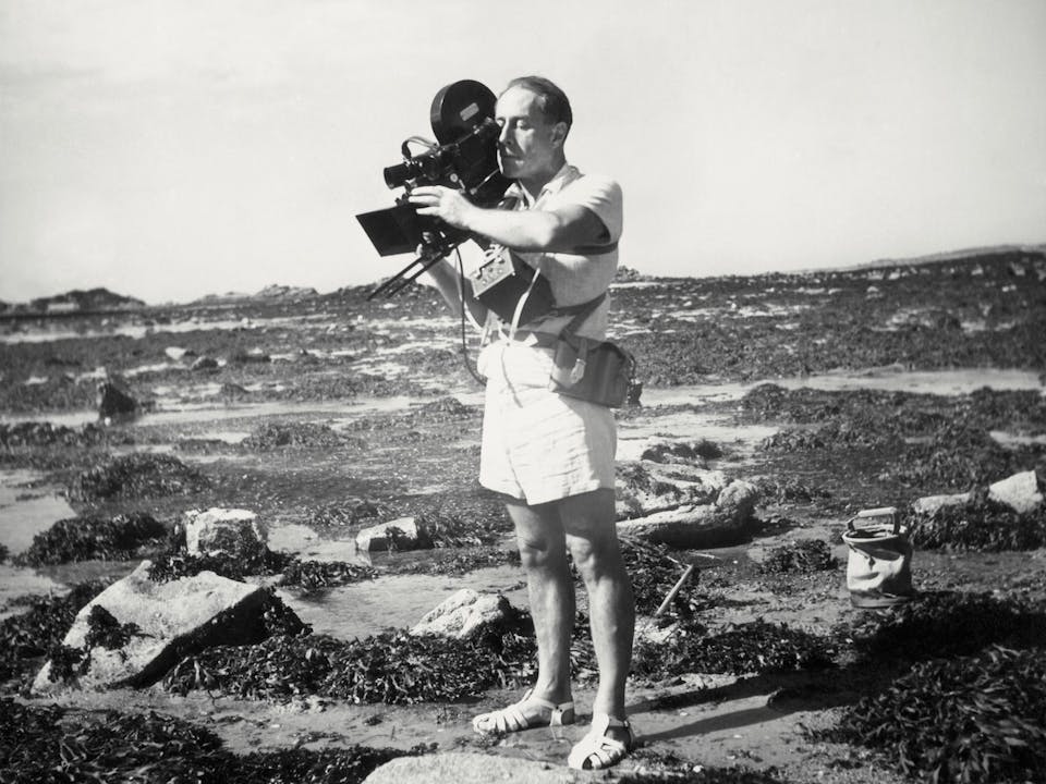 Geneviève Hamon, Jean Painlevé with the Caméflex camera (held by the harness designed