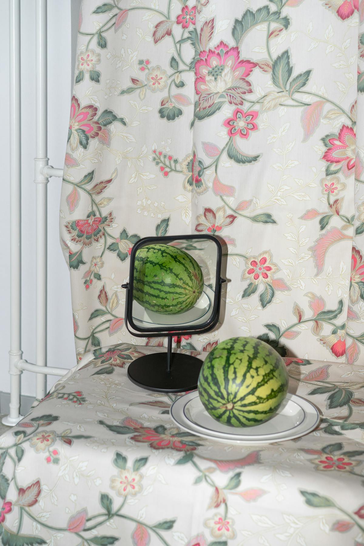Katri Heinämäki, Display of Garden Fruits and Flowers. Class 20. ”On the Lone Prairie”. An Arrangement Using an Object – With Printed or Painted Material, 2021, from the series Mrs. S © Katri Heinämäki