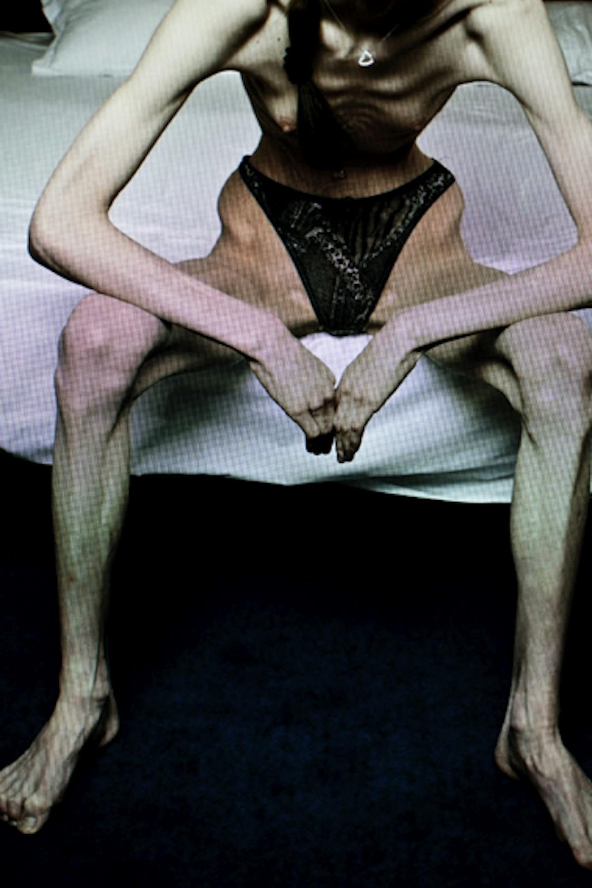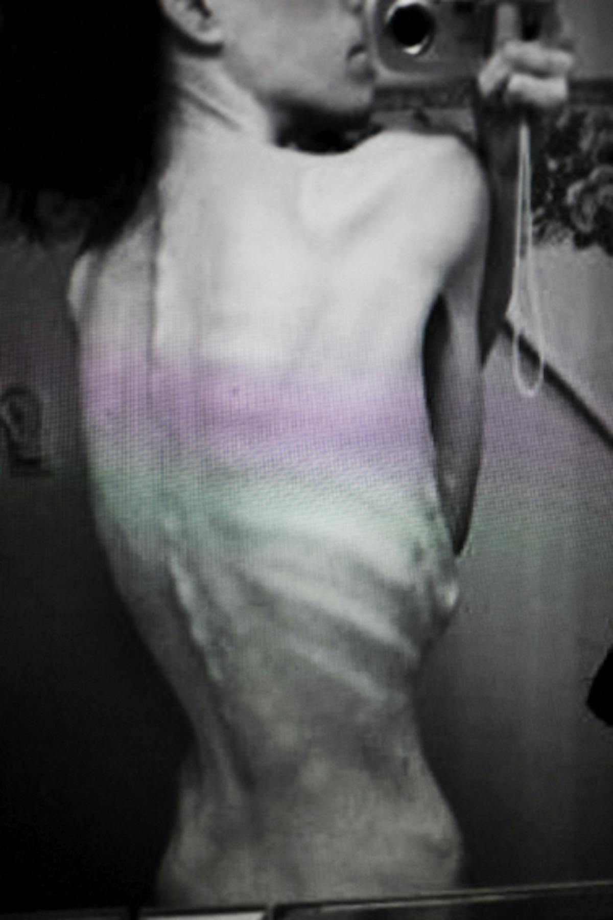 Thinspiration Mosaic consists of a series of portraits of young anorexic girls from Pro-Ana groups. These online communities advocate anorexia as a lifestyle and propagate eating disorders through a glorification of the emaciated female body. Laia Abril captured their visual language by taking photographs of the thousands of vernacular self-portraits shared by Pro-Ana members on their blogs and websites. In this act of re-photographing, the artist turns their bodies into an abstract landscape of compulsion and destruction. Devoid of individuality, they are transformed into a shocking document of our society’s obsession with control and self-optimisation. Part of a larger project on the topic, Thinspiration Mosaic questions the consequences of aesthetic and social standards that are imposed and reinforced by mediated images. The project reveals the complex economy of images that shape our ideas of beauty and definitions of gender, questioning the role of photography and its circulation in social networks.