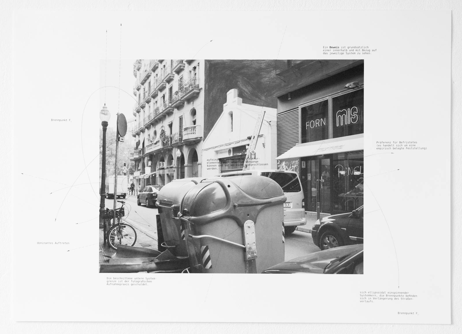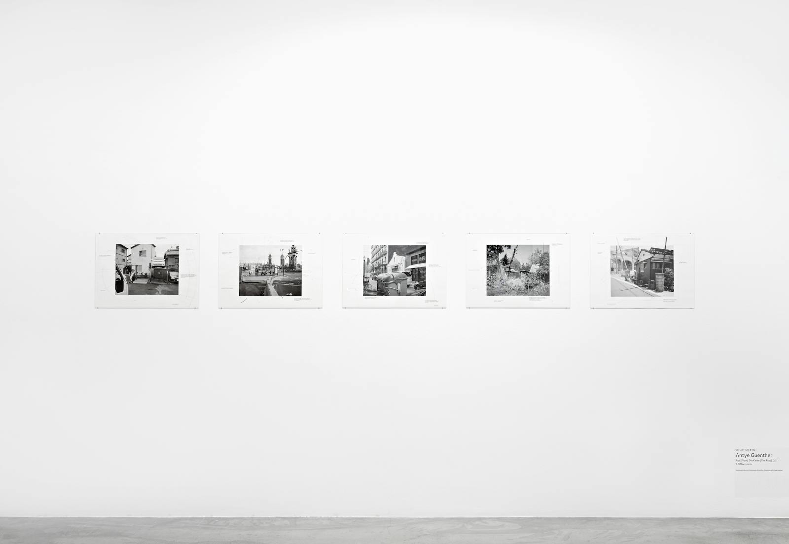 In her work Die Karte (The Map), Antye Guenther begins with the claim that “the urban realm, as a chaotic, self-organising space, is capable of creating highly complex normative structures”. To test this hypothesis, she photographed urban scenes while wandering through European, Russian and Japanese cities. The outcome is a series of images of backyards, busy traffic intersections, side streets and building sites, to which Guenther restropectively added diagrams and comments. These superimposed arrows, circles and other markings add to the already dense character of the imagery. In attempting to break down the encountered scenes and prompt questions relating to both visual analysis and urban development by means of a technical, bureaucratic language, Guenther ultimately – not without a sene of irony – alters the linear perception of the series and evokes associations with system and chaos theory.