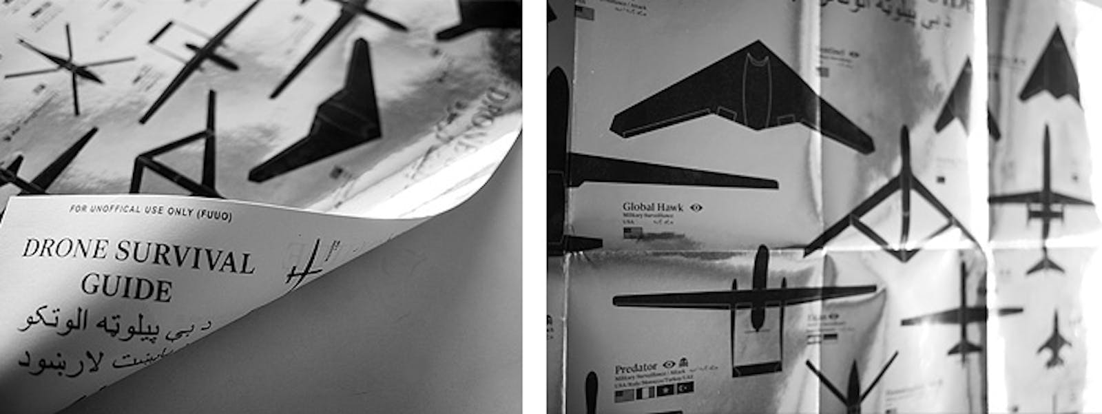 Ruben Pater’s Drone Survival Guide, now available in over 30 languages, provides a means of identifying the flying machines that are increasingly placing populations under forms of lethal surveillance. A modern version of the wartime aircraft recognition guide, we are presented with an array of drone silhouettes with both surveillance and attack functions. Pater’s Guide also provides advice about how to hide from drones and how to hack into their control systems. Designed from the point of view of avoidance or resistance, its cartographic form is itself suggestive. Contemporary counter-insurgency doctrine includes the construction of so-called life cartographies, using surveillance of all kinds to construct patterns of activity that might help predict behaviour.