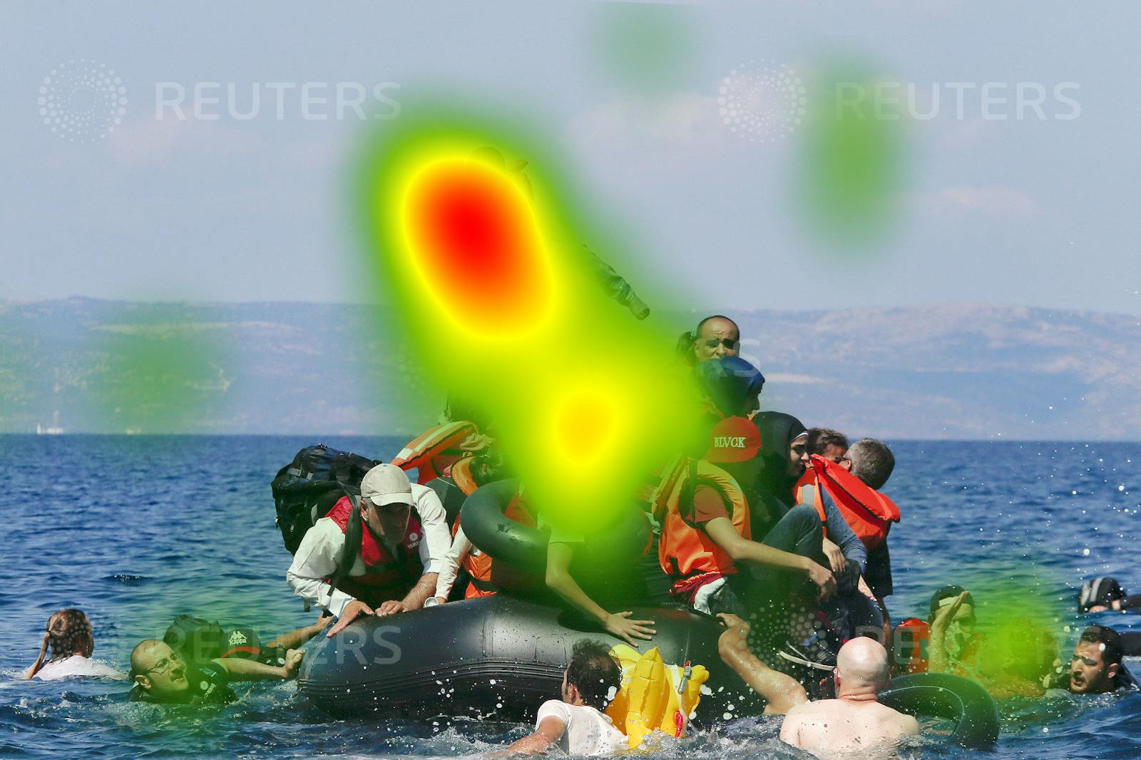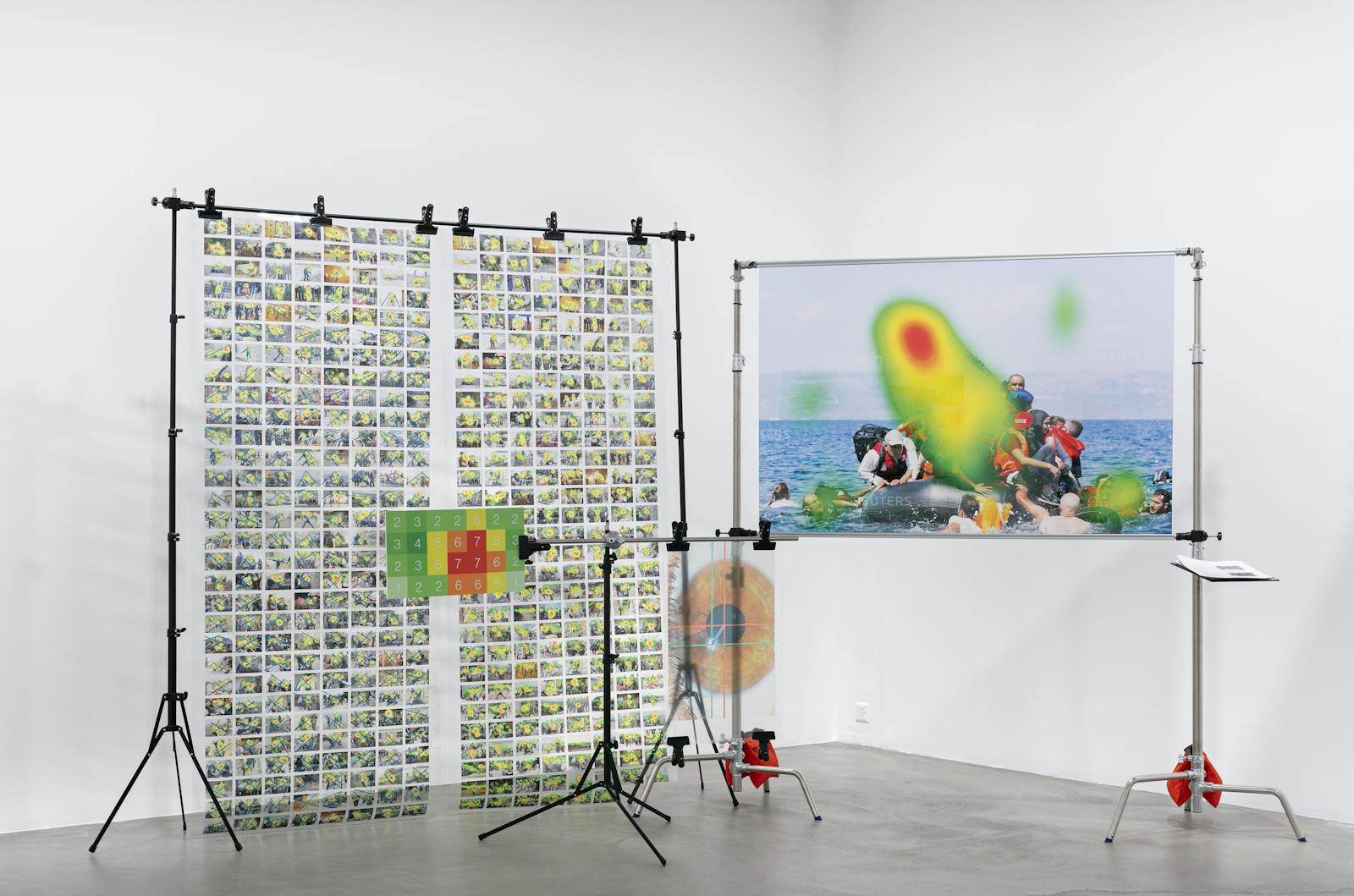 In Gazeplot, Coralie Vogelaar exposes the relation between human and machinic gaze in the context of online news images. The work builds on the artist’s research to compare the online popularity of images – indexed by Google based on their reproduction rate – with an analysis of the looking behaviour of viewers. Employing eye tracking technology to capture and compare the different gazes of 12 participants exposed to a total of 500 press images, Vogelaar reveals a correlation between the popularity of an image and the gaze’s focus, identifying a heightened attention for certain compositional patterns. As the data would suggest, our looking behaviour is (pre-)constructed by the millions of images we have been exposed to, so that we instinctively search for familiar patterns and visual elements that have informed and trained our gaze. Overlaying heat maps and diagrams on the original image sources to expose the regions of visual interest, Gazeplot reveals a pattern to detect successful and unsuccessful news images. The unsuccessful images are prone to be ignored by both the eye and the indexing algorithm, as Google will display the least successful ones at the very bottom of the image search where they are hardly seen and will eventually be deleted. Gazeplot thus reveals the complicity of human attention and algorithmic visual analysis as they spawn a standardised “successful” gaze that promotes a uniform image typology.