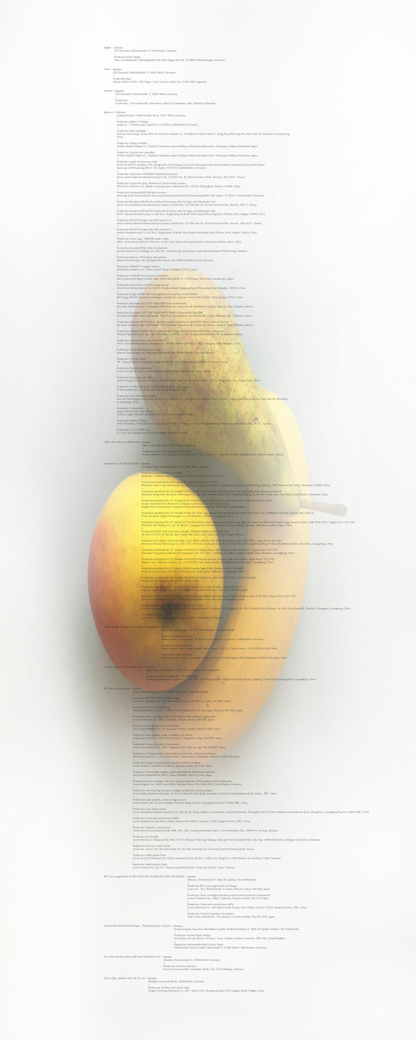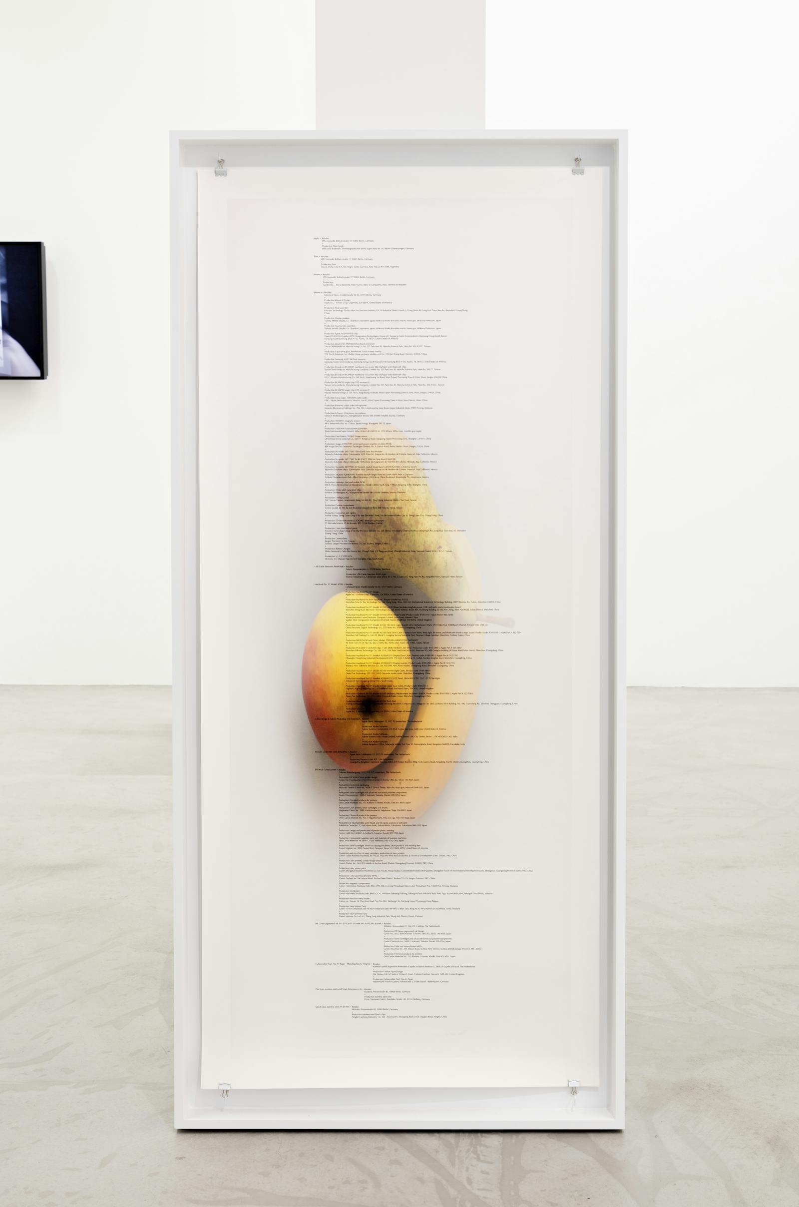 The digital print Image Transfers – Apple, Pear and Banana by Anne de Vries lays bare the different levels of production employed in the realisation of the image. De Vries provides detailed information of the technological infrastructure required, where the photographed fruit came from, the image editing software (complete with updates) used, and the other steps taken before the image reached its final state as an artwork in the year 2012. These chains of production and circulation are overlaid onto the innocent-looking still life like an exhaustive protocol. It illustrates how images – in the form of objects and goods – are integrated into global economic structures and mechanisms; in processes and dynamics that (almost) never reveal themselves in photographic images, but always form part of them.