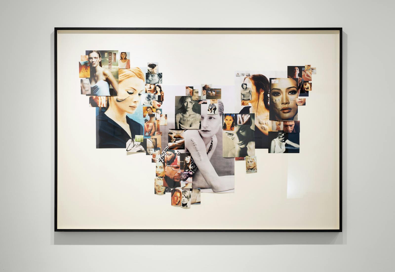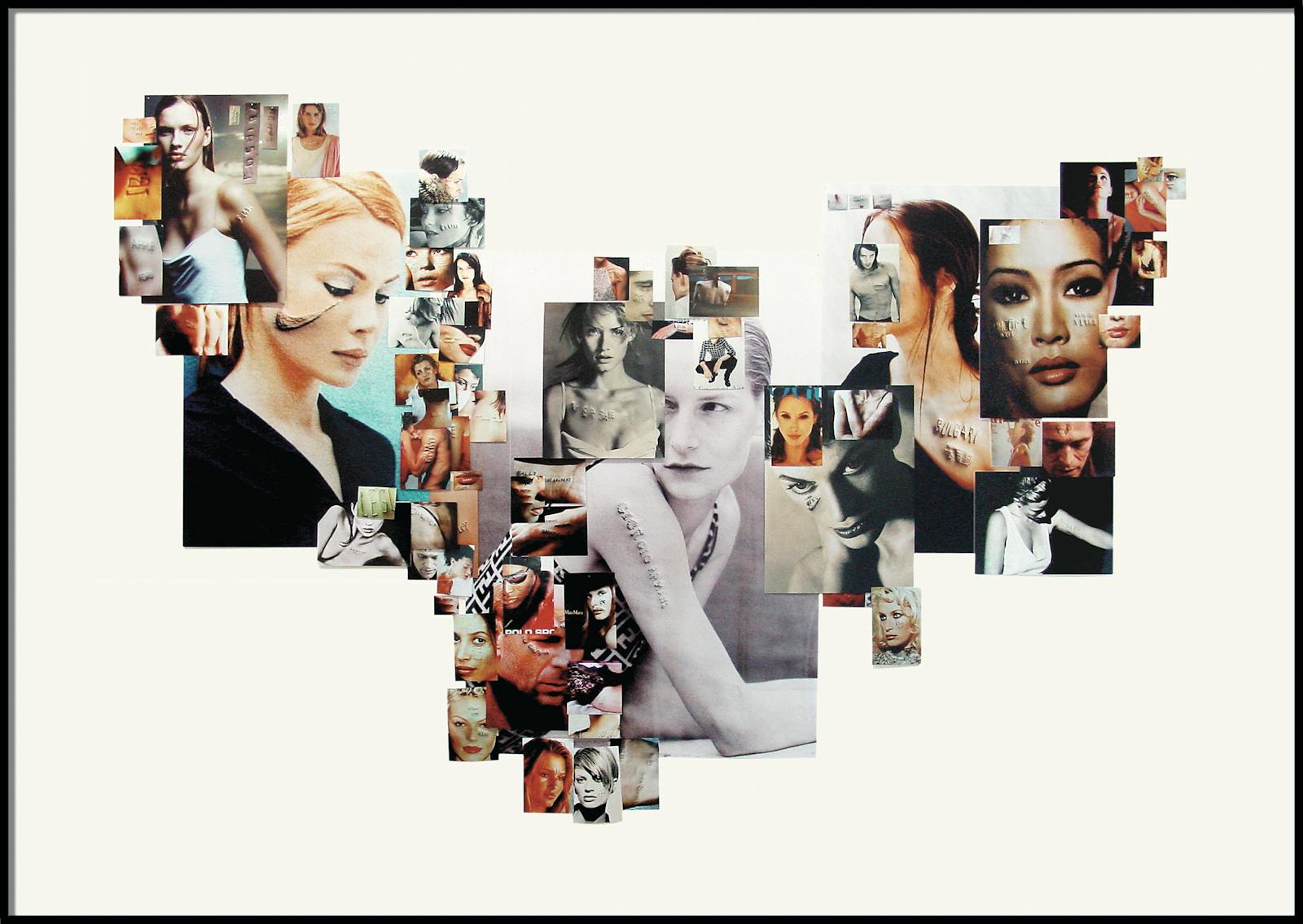 In his collage “Pinwall” which forms part of the series Looking for Love (1994–2011), Swiss artist Daniele Buetti exposes the ways in which the advertising and fashion industries frame the body, ultimately delivering a critique on our image-driven consumer society. Buetti punches brand logos on the back of advertisements and photo spreads from magazines, re-photographs them and assembles these fragments into a picture wall. “Pinwall” not only reflects on the commodification of the young, athletic, often female body, but also on the lack of critical reception of these media frames and the way this mutually reinforces gender stereotypes and ideals of beauty. Reminiscent of tattoos, Buetti’s violent manipulation of the immaculate advertising shots disrupts the beauty and body cult that still prevails today. This cult was especially fuelled by the emergence of the so-called supermodels and the increasing professionalisation of Photoshop in the 1990s. It is perpetuated by image practices on social media, finding its latest peak in the self-representation of influencers who increasingly stage the body as a brand and shape their identity through products.