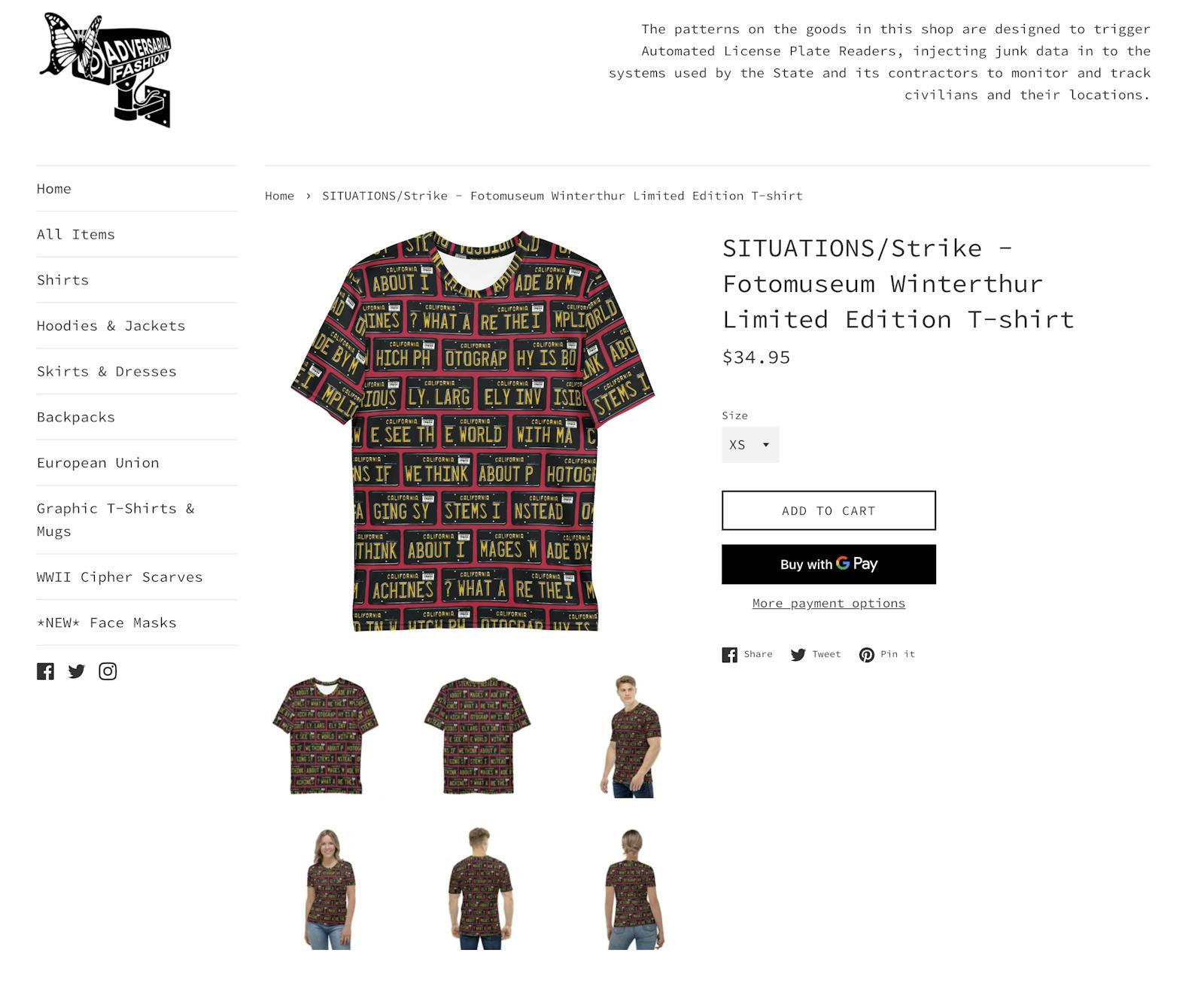 For SITUATIONS/Strike, Kate Rose designed a limited edition of 60 unisex T-shirts, which are available through the artist's website. Instead of mere numbers, an excerpt of the US-american photographer and author Trevor Paglen's blogpost "Is Photography Over?" which was written for the Fotomuseum blog Still Searching... is printed across the license plates on the t-shirt, saying: