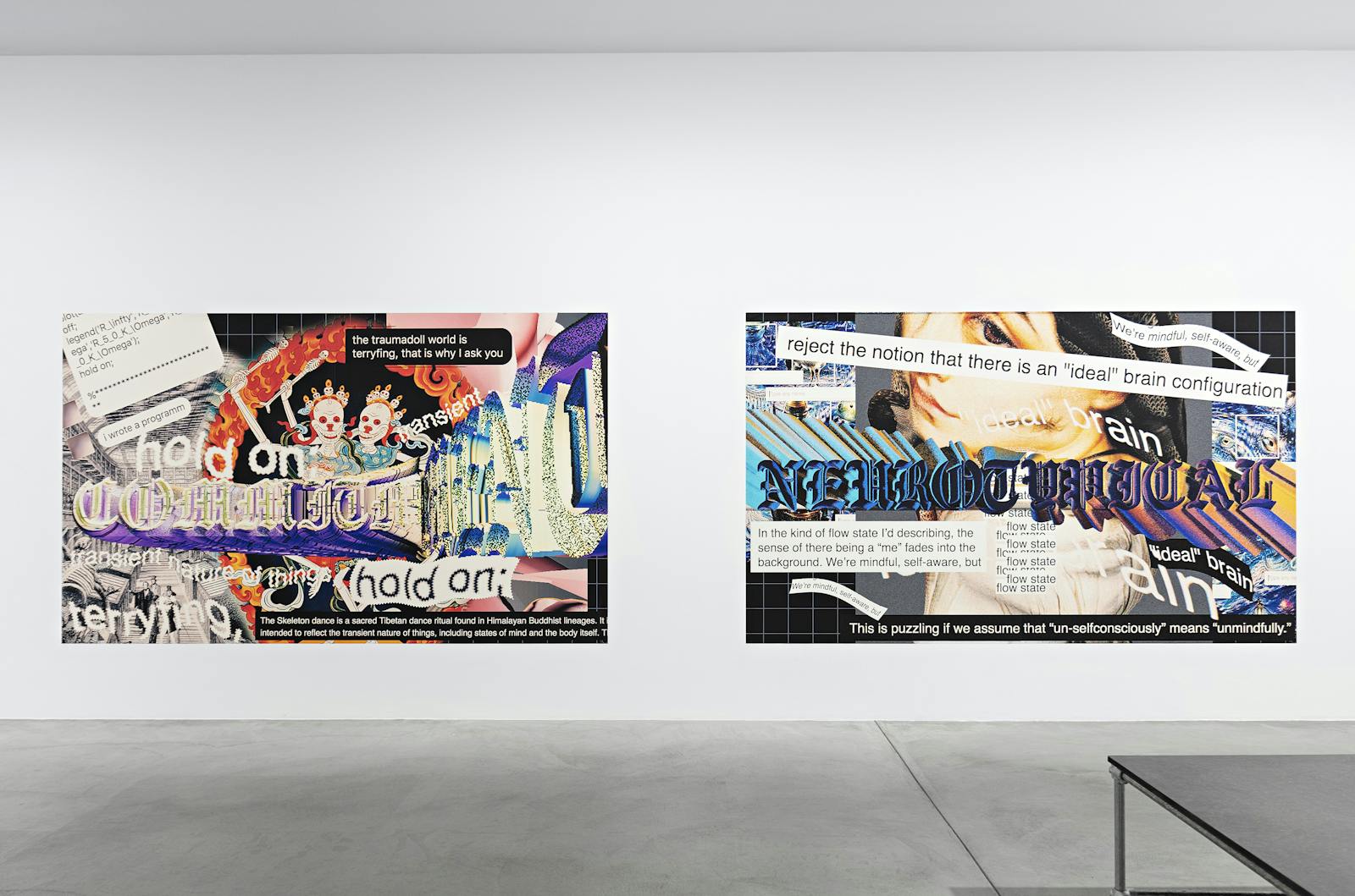 In her artistic practice, Berlin-based artist Sofia Crespo experiments with artificial intelligence, neural networks and computed image recognition. Trauma Doll brings to life an artificial intelligence that suffers from mental illness like depression or PTSD. To cope with its anxieties, this A.I. trauma doll gathers visual and textual elements from all over the internet – quotes, headlines, photographs, code, drawings – and assembles them to create highly dense collages that appear digital in their aesthetics yet also reminiscent of a more traditional poster design. According to the artist, Trauma Doll “sees patterns everywhere in the web and connects them”, generating forms of expression that tap into a larger societal discussion of how our mental and emotional landscapes are increasingly influenced by digital technologies. Delegating the profoundly human experience of mental illness to a generative A.I. authorship, Trauma Doll raises questions of agency as well as the affective and psychological aspects of our networked society.